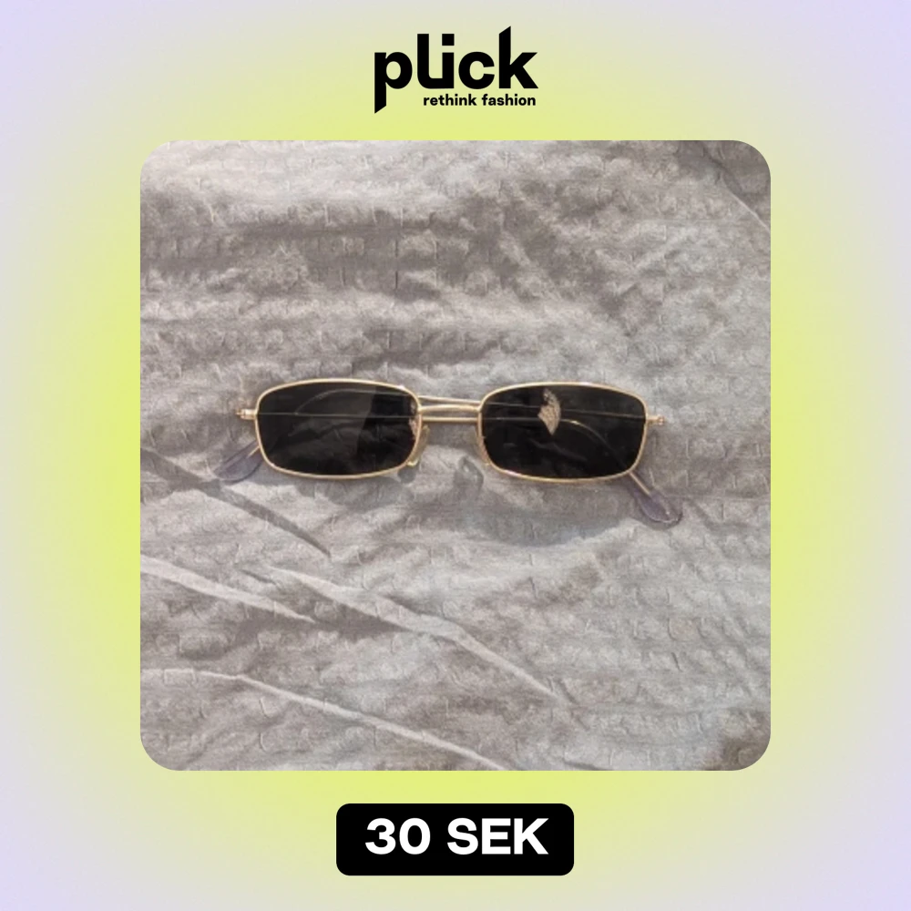 Ett par rektangulära solglasögon med en tunn guldfärgad metallram och mörka linser. Glasögonen har justerbara näskuddar och smala skalmar med genomskinliga ändar.