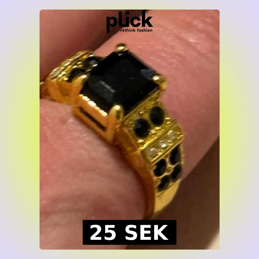 Bilden visar en guldfärgad ring med svarta och vita stenar