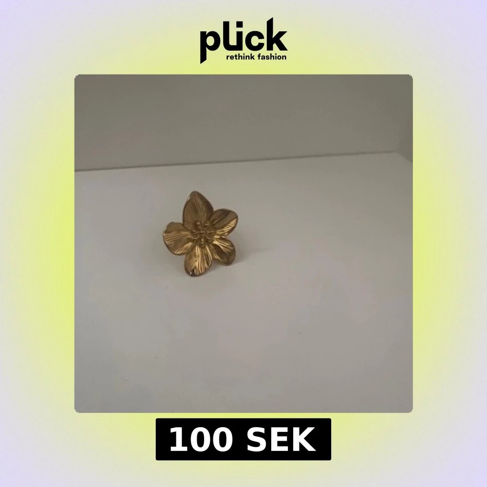 Säljer en snygg ring i guldton med en stor blomformad design. Ringen har detaljerade blad och en cool, iögonfallande look som verkligen sticker ut. Perfekt för dig som vill ha något unikt och trendigt till din stil.