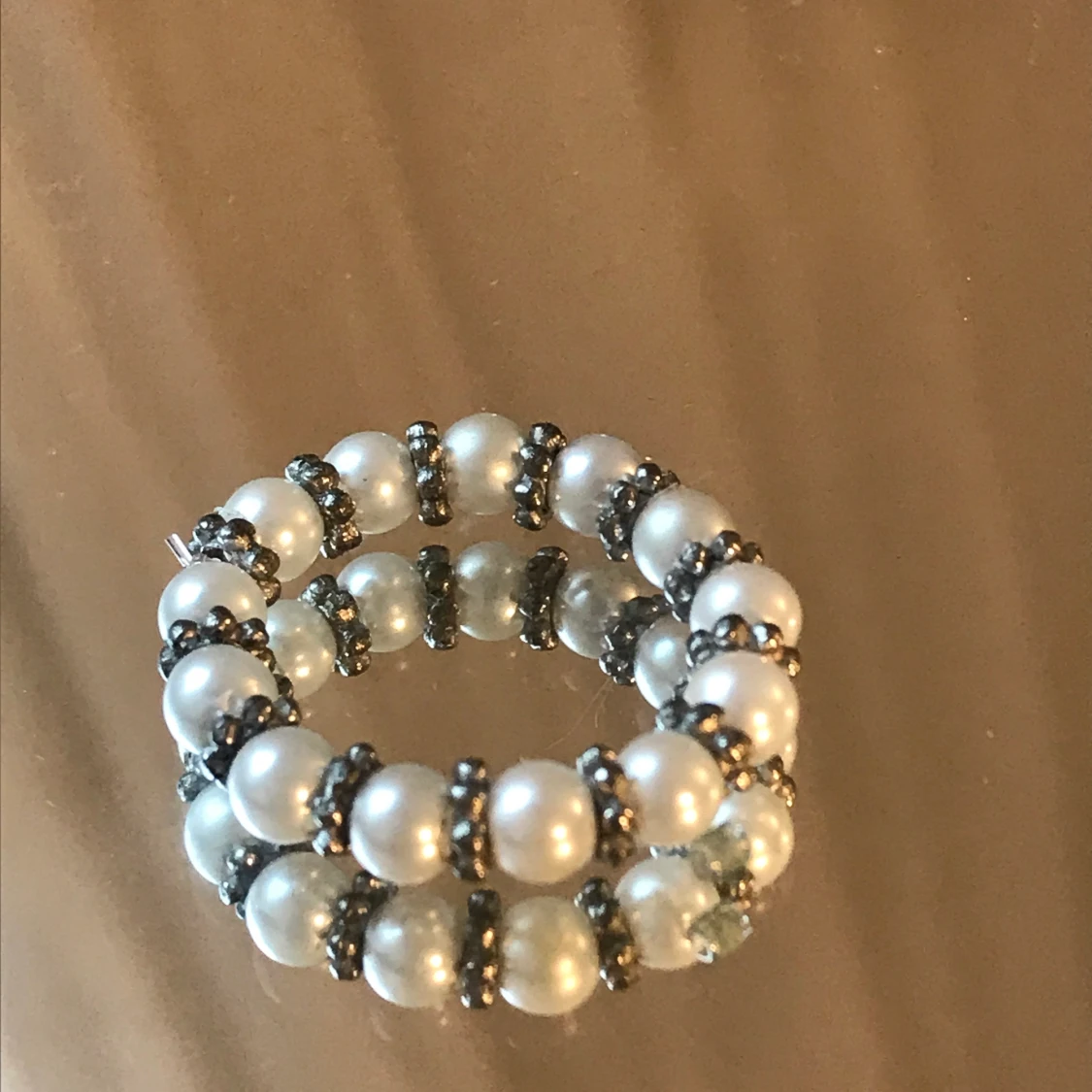 Ring med vackra vita silkespärlor med silvriga mini blommor mellan. Gjort i gummitråd så ringen är elastisk och passar de flesta fingrar. Alla pärlor jag använder är återvunna från secondhand. Så varje smycke är unik och av begränsat antal;) frakt 11kr