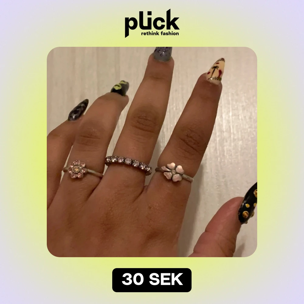 set med tre silver ringar med rosa detaljer, stenar, blomma, fyrklöver. 10kr/st - alla för 30kr. ringen med stenarna är töjbar.