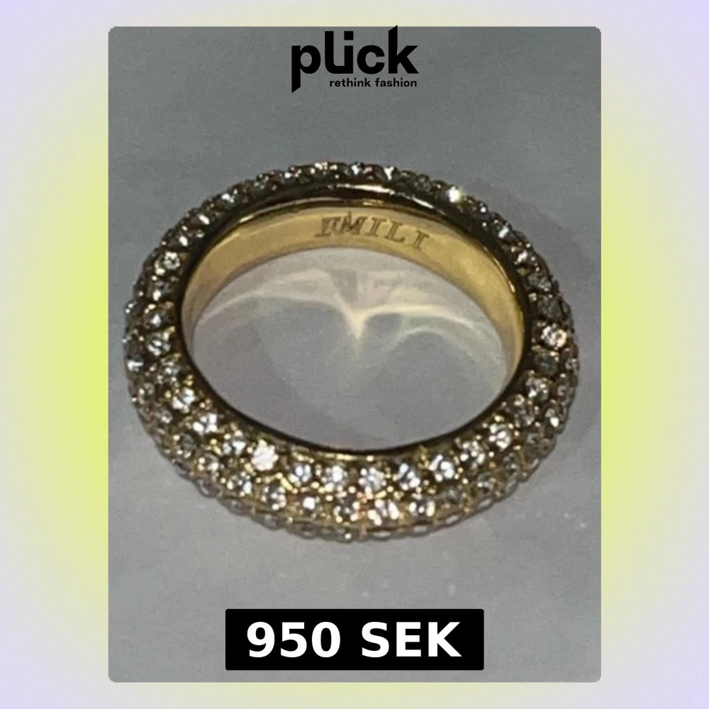 Säljer en chunky guldig ring från EMILI, täckt med glittrande stenar runt hela ringen. Ringen har en rund och lite tjockare form som verkligen sticker ut. Perfekt för dig som gillar att glänsa och vill ha något extra till din stil. Har fyndat denna andra hand, såg att liknade ring av samma märke ligger på 2500-3000kr! Ser sprillans ny ut!