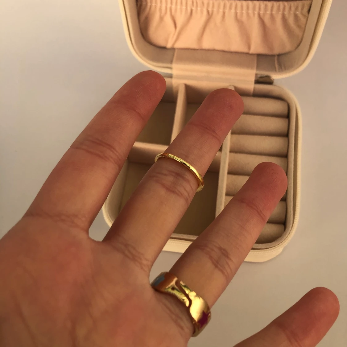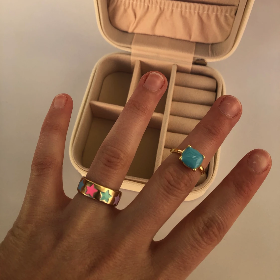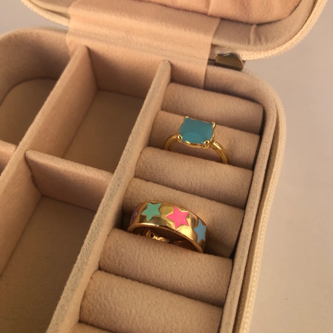 Två superfina ringar i guld färg. Den med stjärnor går delvis att justera men inte den blå. Färgar inte av sig. Stjärnor kostar 50kr och den blå 30kr. Båda för 60kr. Frakt tillkommer. Skriv gärna vid frågor 💙💗