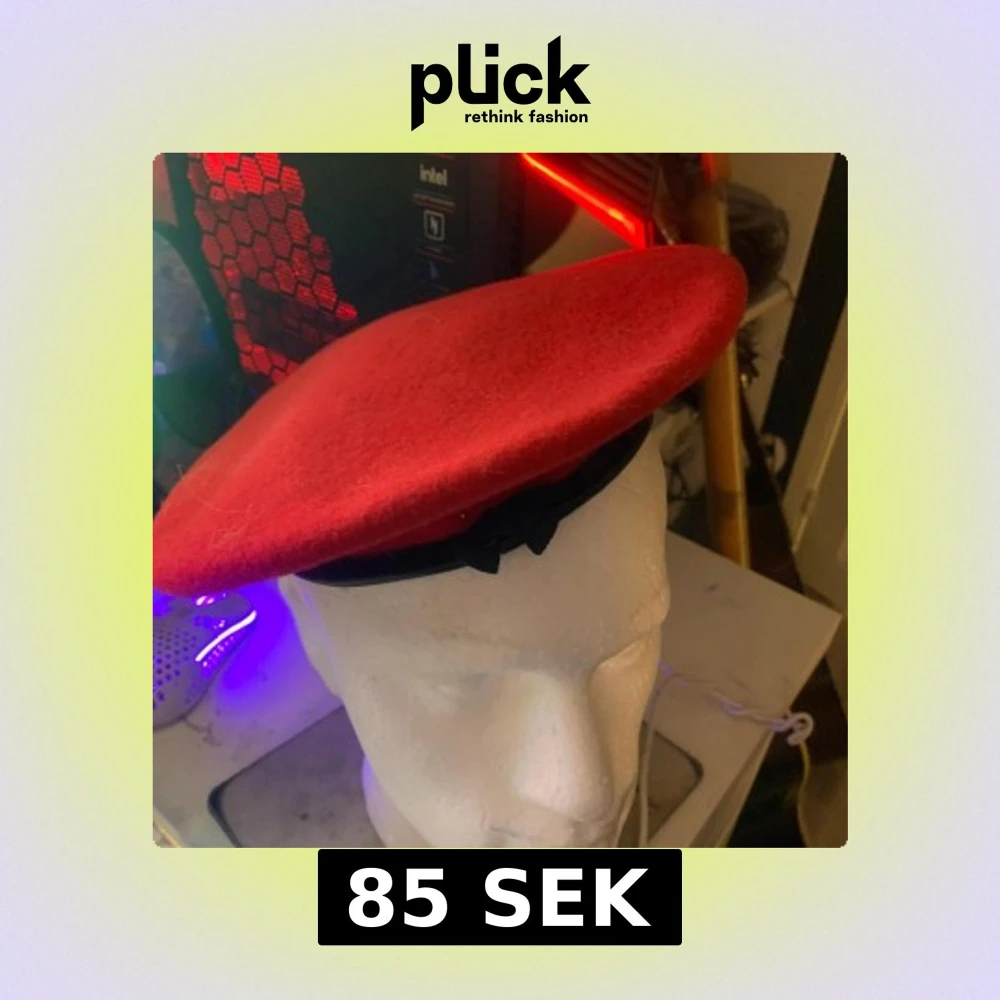Säljer en klassisk röd basker från Kangol i 100% ull. Den har en rund form och är dekorerad med en liten svart rosett på insidan. Perfekt accessoar för att lyfta din stil med en färgklick.