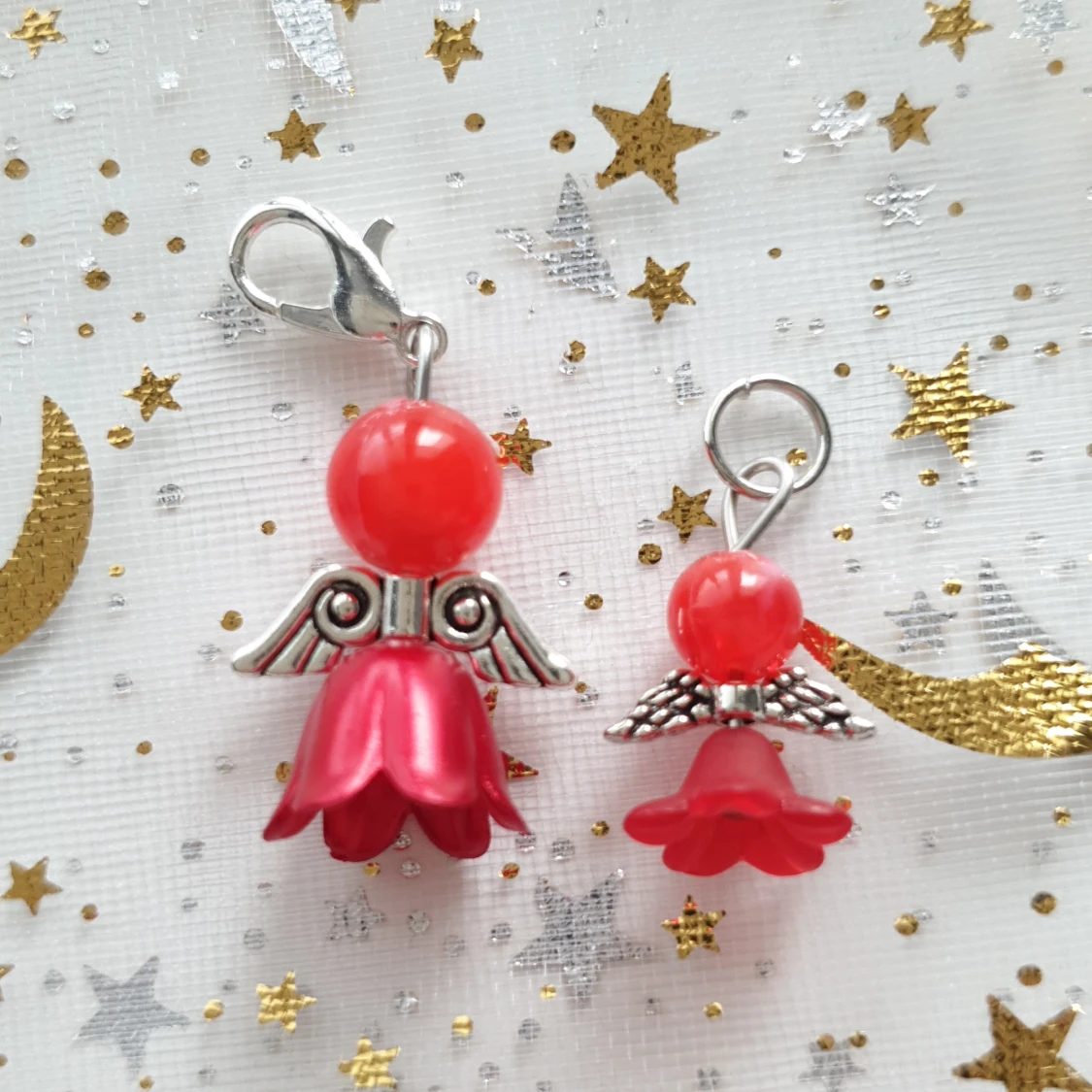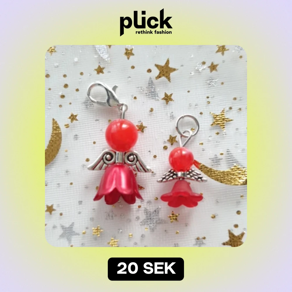 Säljer två supergulliga ängelberlocker i röd färg. De har en stor röd pärla som huvud och en blomformad kjol i plast. Vingarna är i silverfärgad metall och ger en fin kontrast. Perfekta att använda som smyckesdetaljer eller dekorationer. Passar perfekt till jul eller som en söt present!