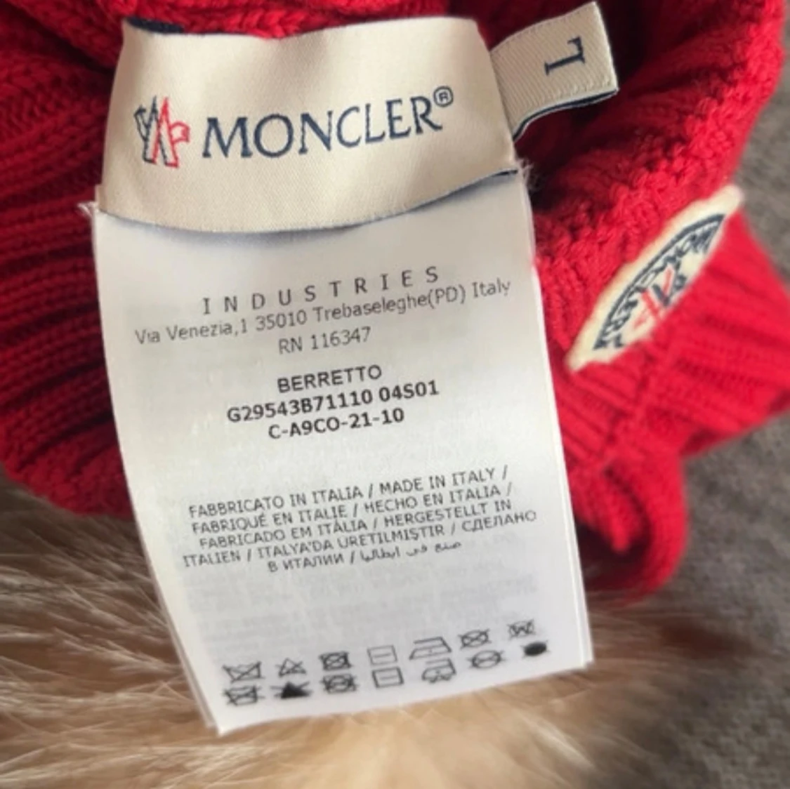 Ribbstickad röd Moncler mössa med stor beige pälsboll på toppen och klassisk Moncler-logga framtill. Mössan är i storlek L men är liten och tight!