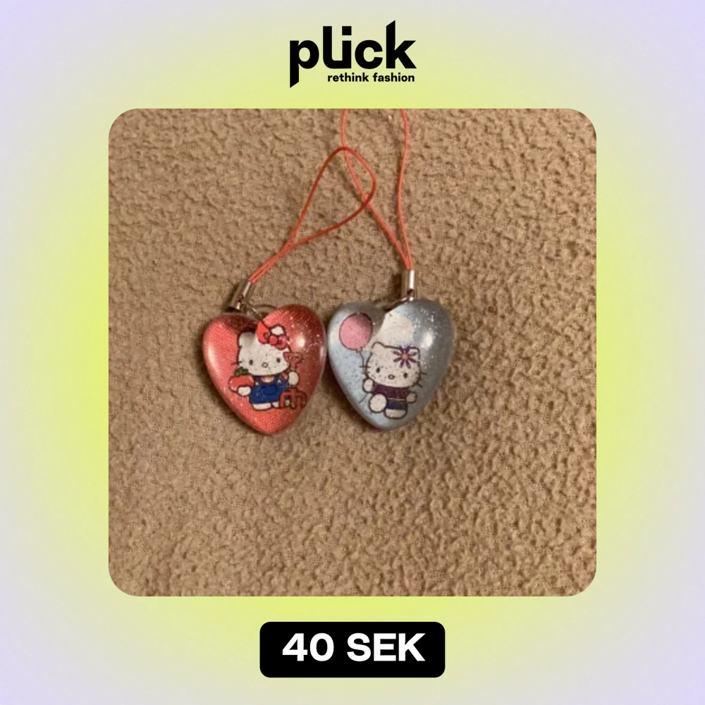 Två supergulliga Hello Kitty-hängen i form av hjärtan. Det ena är rött med en söt Hello Kitty som har en rosett och det andra är blått med en Hello Kitty som håller en ballong. Perfekta som dekorationer eller att hänga på väskan!