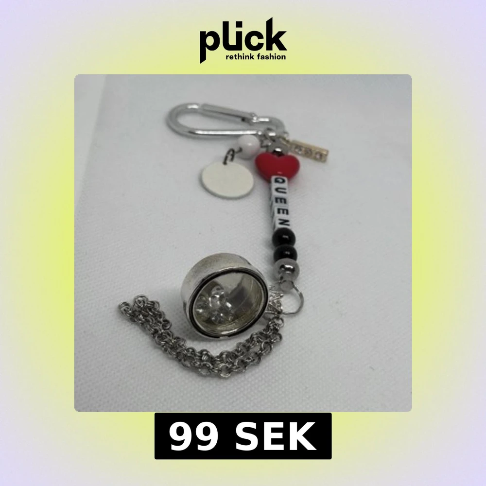 Säljer en unik nyckelring/väsksmycke med en liten krona och dekorativa pärlor. Nyckelringen har en karbinhake och ett hänge med texten 'QUEEN' samt ett rött hjärta. Perfekt accessoar för att hålla koll på dina nycklar/väska med stil.