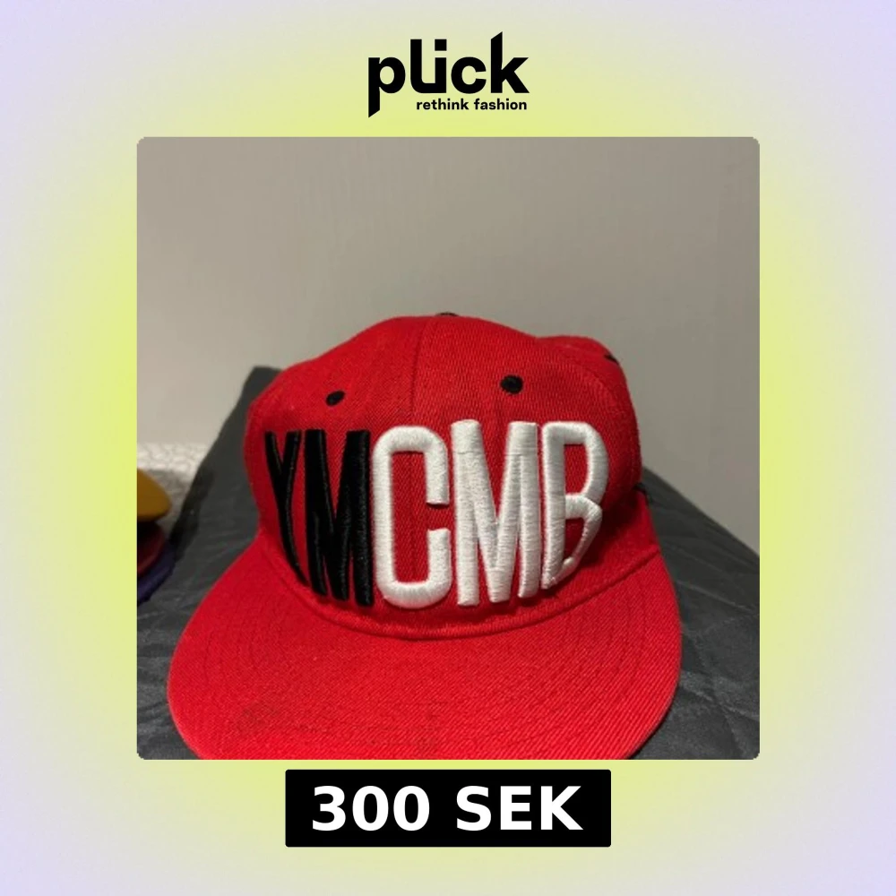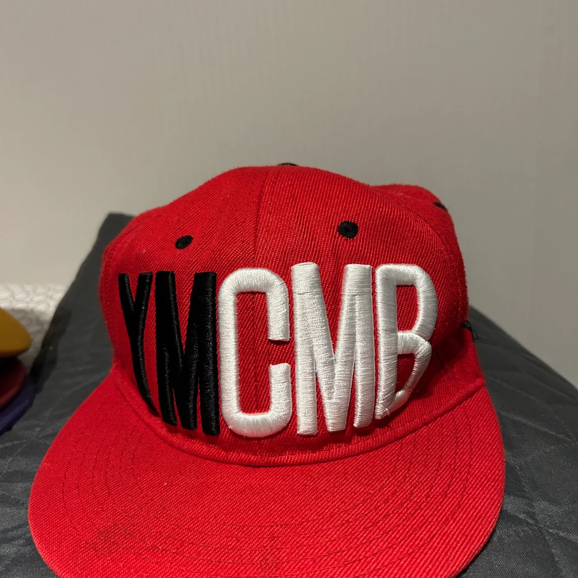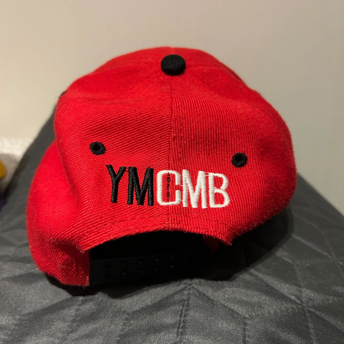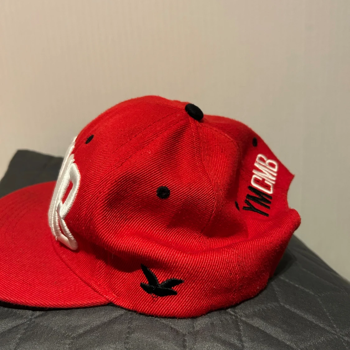 Säljer en röd snapback-keps från YMCMB med stor broderad logga i svart och vitt framtill. Kepsen har svarta detaljer, broderad fågel på sidan och justerbar baksida. Perfekt för dig som gillar streetwear och vill sticka ut med en ikonisk look.