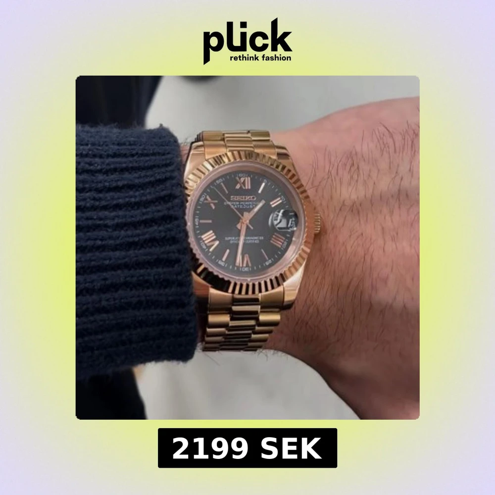 Elegant guldfärgad klocka från Seiko med svart urtavla och romerska siffror. Klockan har ett datumfönster och en klassisk länkarmband i metall. Perfekt för den som vill ha en stilren accessoar.