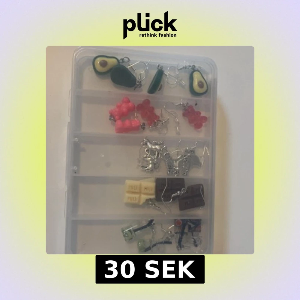 Säljer ett gäng unika örhängen med olika matmotiv som avokado, geléhallon, mjölkchoklad och läskflaskor. Färgerna är blandade med inslag av grönt, rosa, gult och brunt. Perfekt för dig som vill ha något annorlunda och lekfullt i öronen!