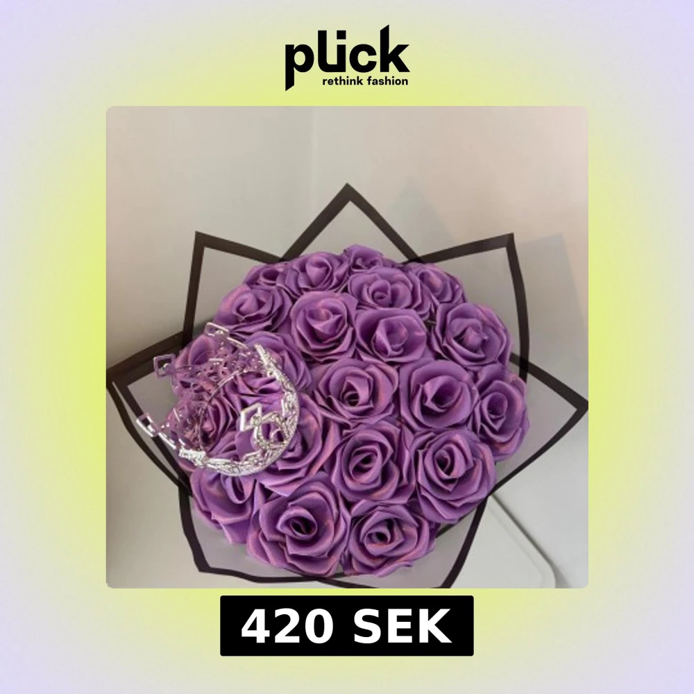 En lila handgjord evighetsbukett med 21 rosor gjorda av sidenband och en silvrig krona med diamanter på💜💎