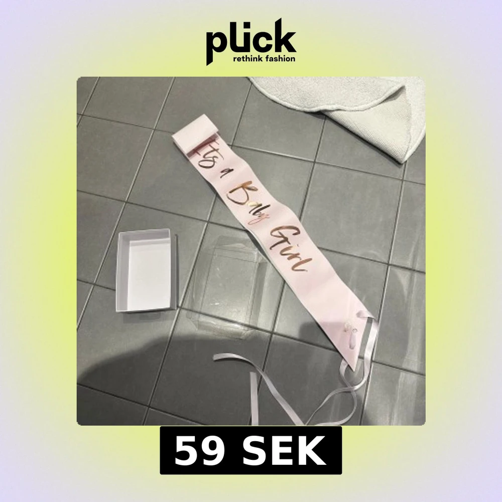 Säljer ett rosa band med texten 'It's a Baby Girl' i guld. Perfekt för babyshower eller gender reveal. Bandet är brett och har en elegant glansig finish.