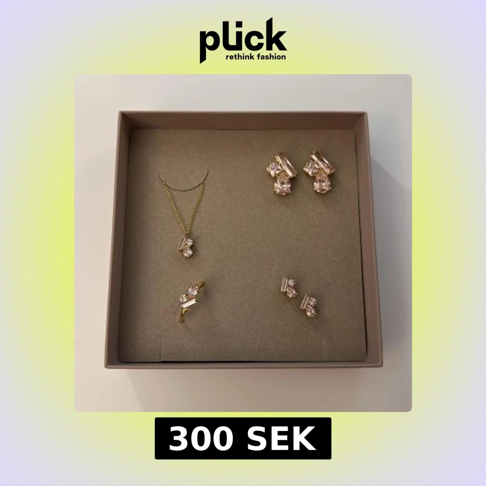 Smyckeset från Edblad med halsband, ring och två par örhängen i guldpläterad metall. Alla delar har ljusrosa stenar som är mycket mer rosa i verkligheten. Ringen skulle jag bedöma som M/L. Ej orginal box.
