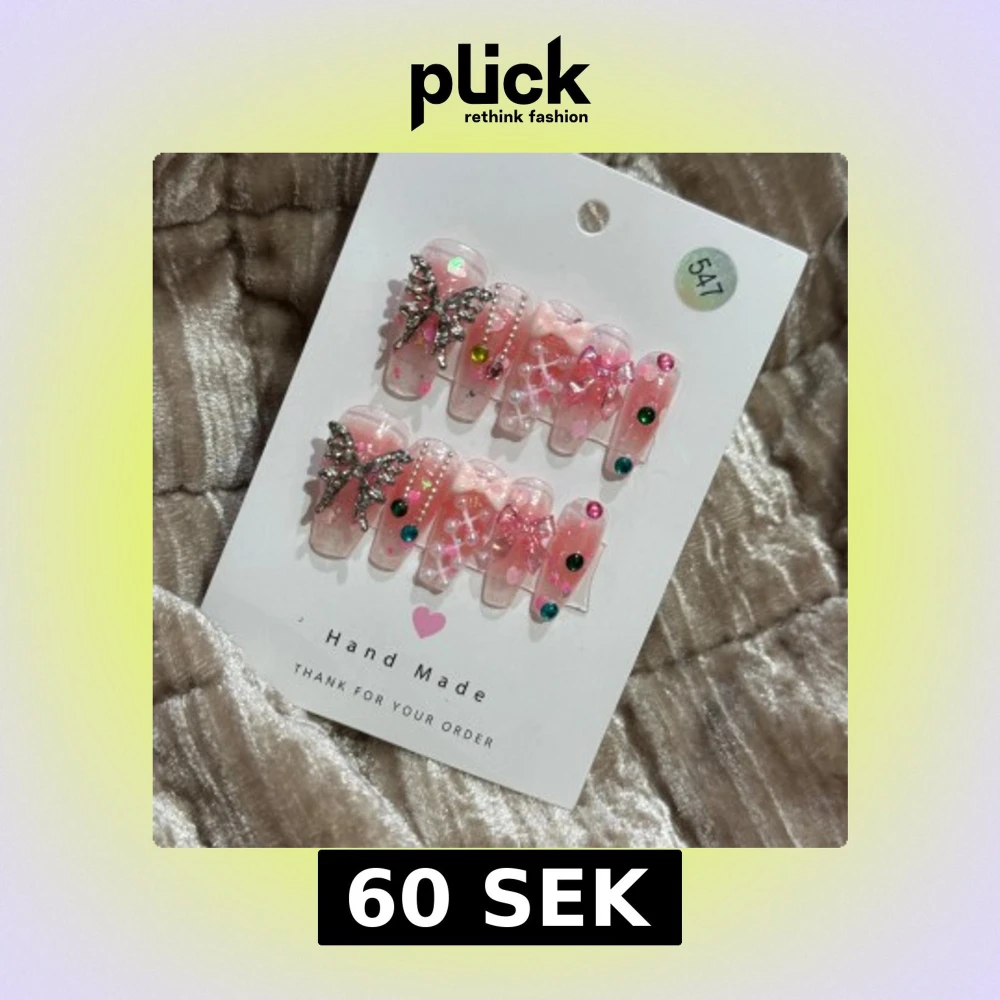 Säljer ett set rosa lösnaglar med glittrig finish, dekorerade med pärlor, färgglada stenar, vita linjer och stora silvriga fjärilar. Naglarna har även små rosetter och hjärtformade detaljer för en extra söt look.