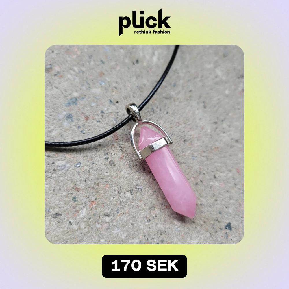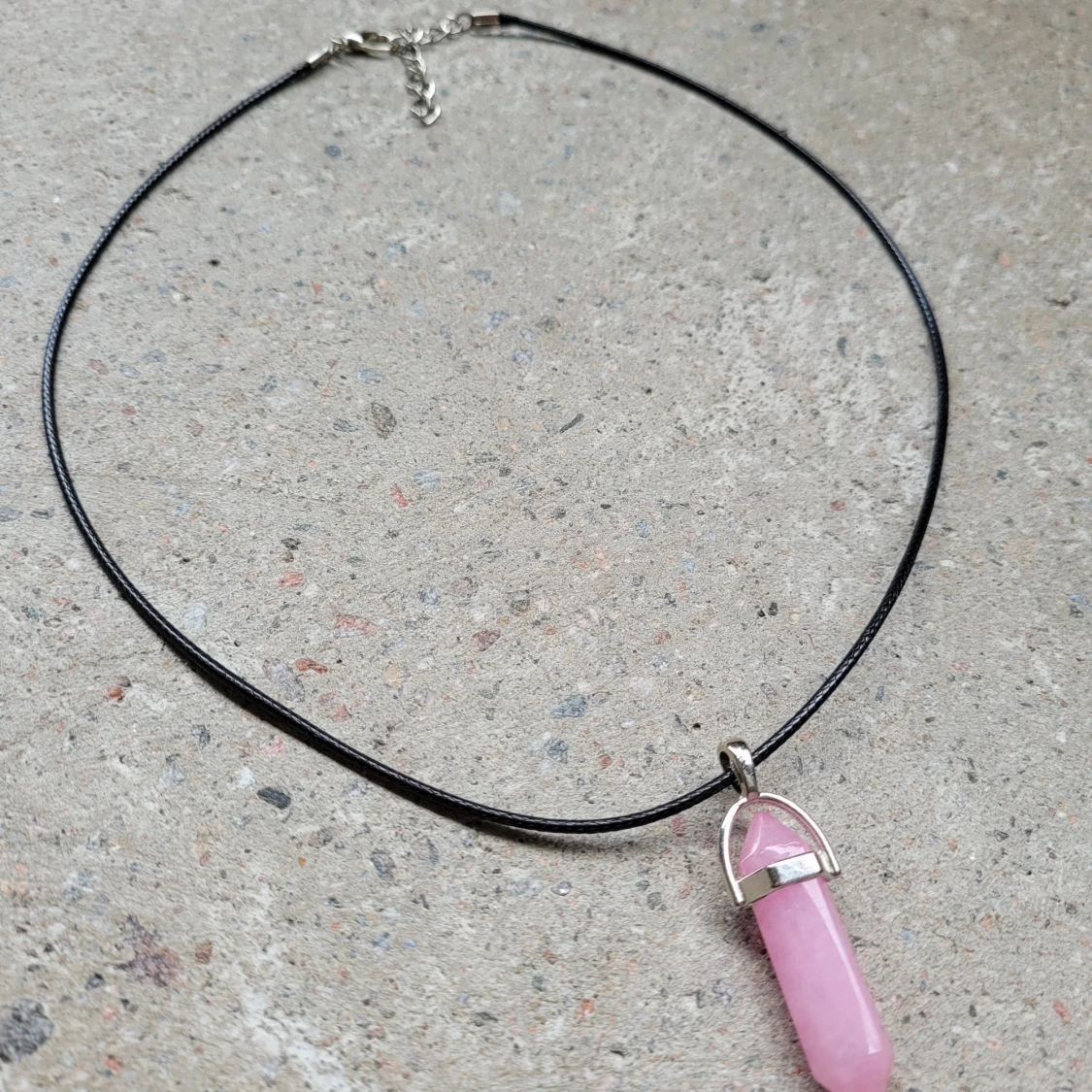 Snyggt halsband med en rosa kristallhänge i en silverfärgad infattning. Hängs på en tunn svart rem som ger en stilren look. Perfekt för att lägga till en touch av färg och mystik till din outfit. Passar både till vardags och fest! Hänget är av glas. Remmens längd ca 45cm.