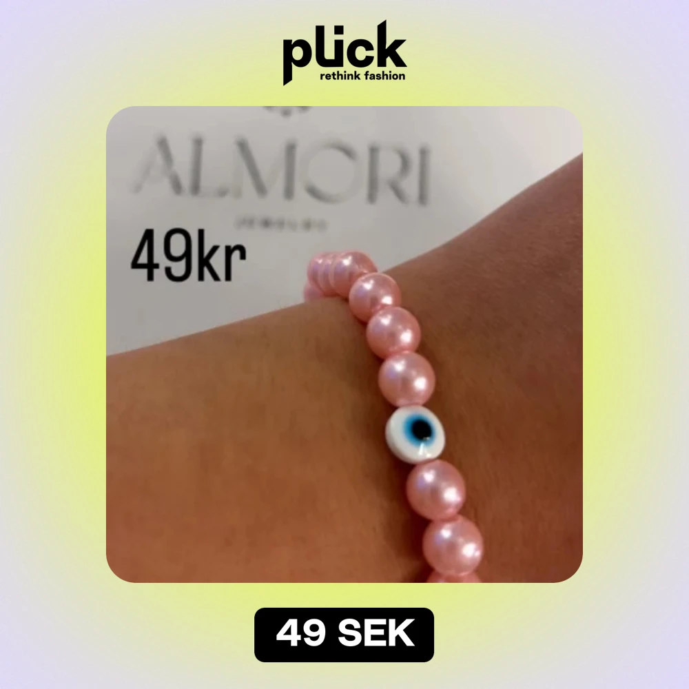 Ett rosa pärlarmband från Almori med ett dekorativt öga. Armbandet består av rosa pärlor och en pärla med ett öga i blått och vitt.
