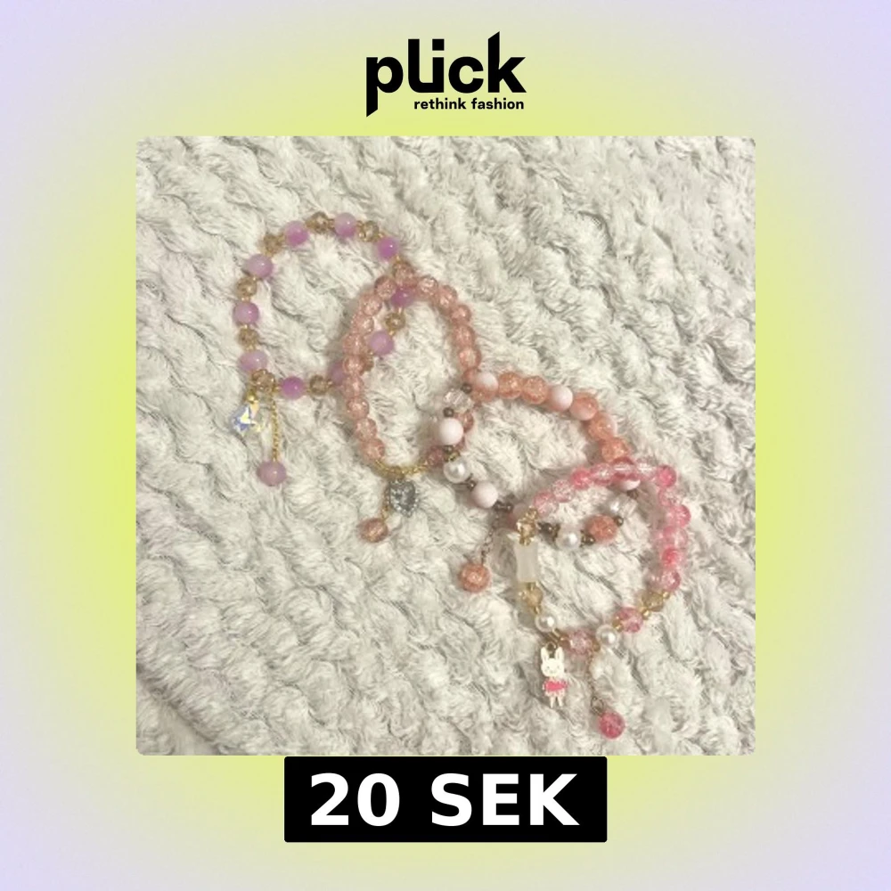 Fyra armband i rosa toner med glittriga och pärlformade pärlor. Armbanden har detaljer som hjärta, stjärna och en kaninberlock. Perfekta accessoarer för att piffa upp din stil. Alla för 20kr.