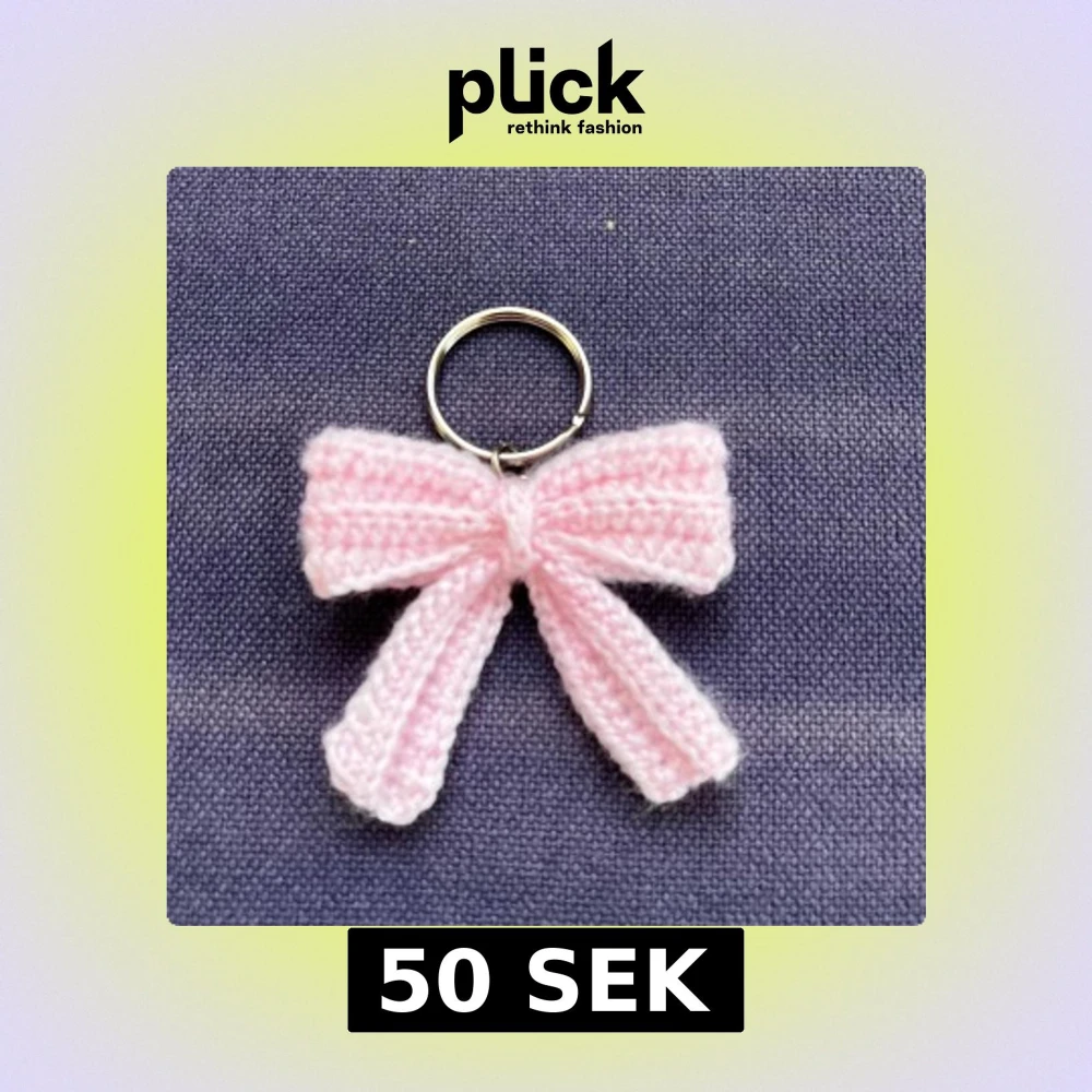 Söt handgjord nyckelring med en virkad rosett i ljusrosa. Perfekt att hänga på väskan eller nycklarna för en gullig touch. Rosetten är mjuk och har en klassisk form med två långa band. Gjord av mig!