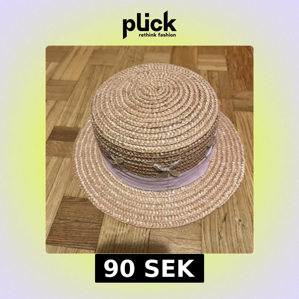 Söt rosa stråhatt från H&M med brett, ljusrosa band runt kullen och dekorativa blommor i transparent material. Klassisk form med platt kulle och brätte, perfekt för soliga dagar och sommarhäng.