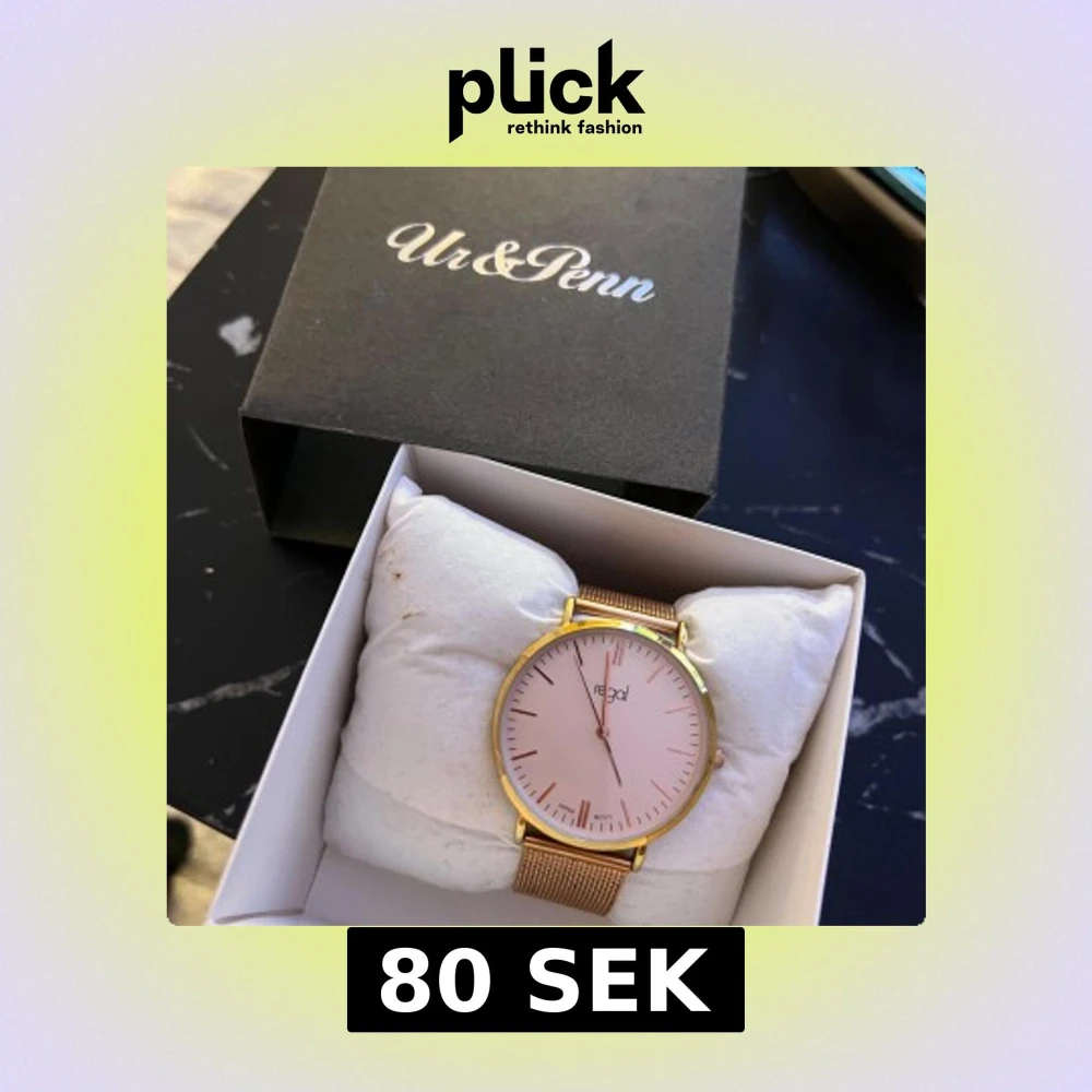 Stilren klocka från Regal med mesharmband i guld och en ljusrosa urtavla. Klockan har minimalistisk design med tunna index och guldfärgad boett. Perfekt accessoar för dig som gillar en clean look och vill sticka ut med detaljer i guld. ( behövs byta batteri ) har legat bara på min byrå i flera år!
