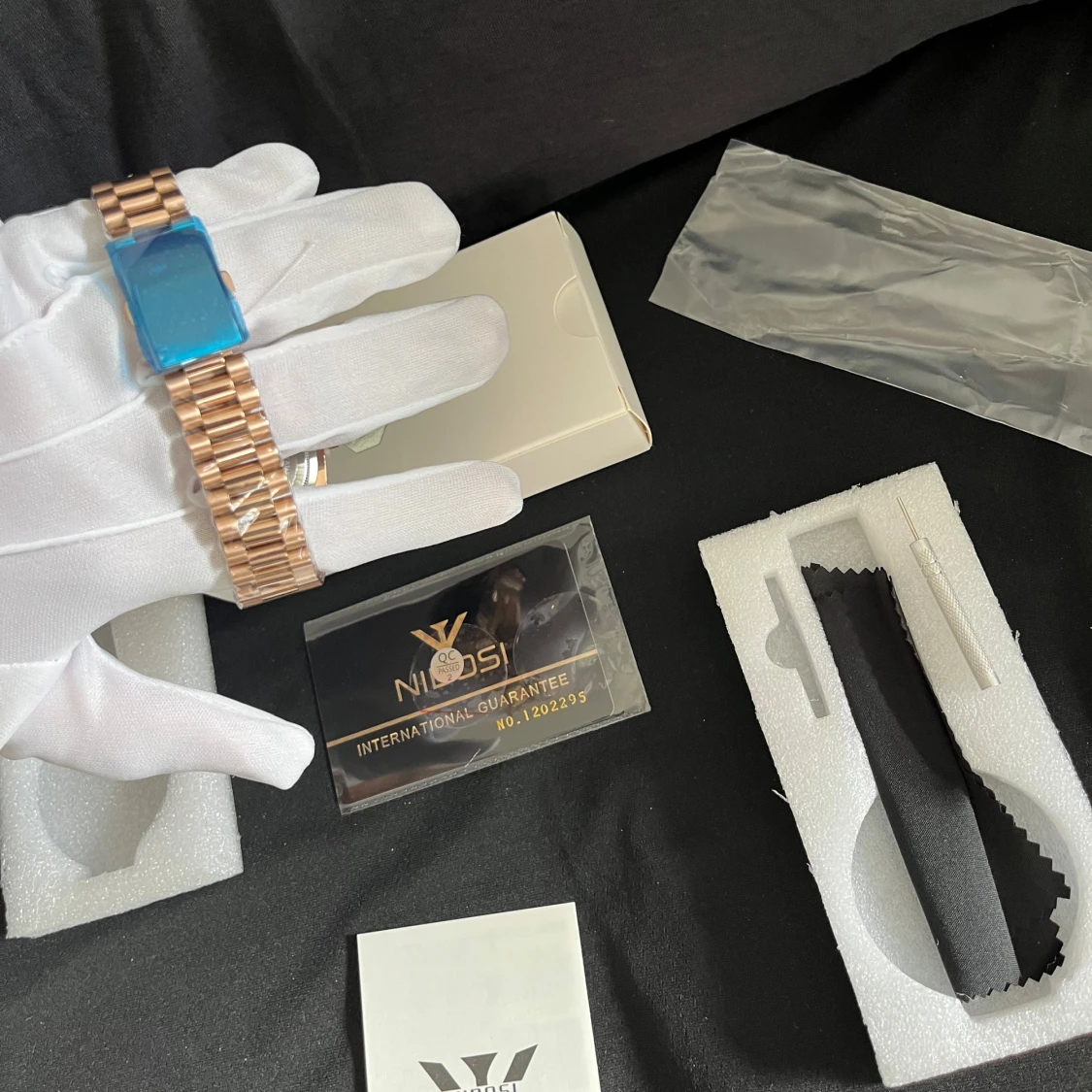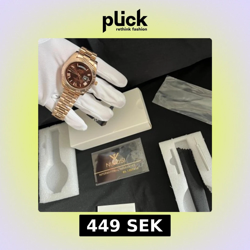Snygg klocka i roséguld med metallarmband och mörk urtavla. Klockan har datumvisning och tydliga indexmarkeringar. Perfekt accessoar för dig som vill sticka ut med stilren design och exklusiv känsla.
