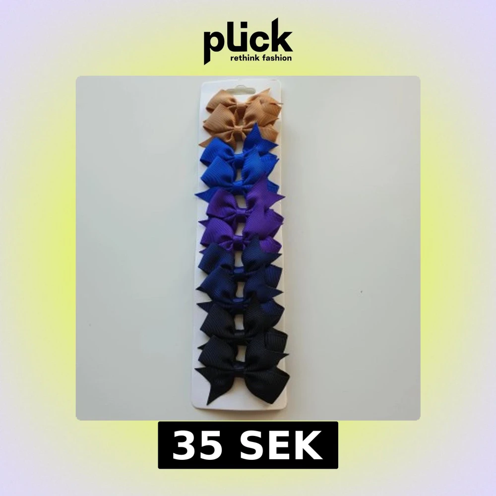 Snyggt set med åtta hårspännen med stora rosetter i olika färger: beige, blå, lila och svart. Rosetterna är ca 6 cm breda och har en klassisk form. Perfekt för att ge din look en extra touch. Skick: nya/oanvända