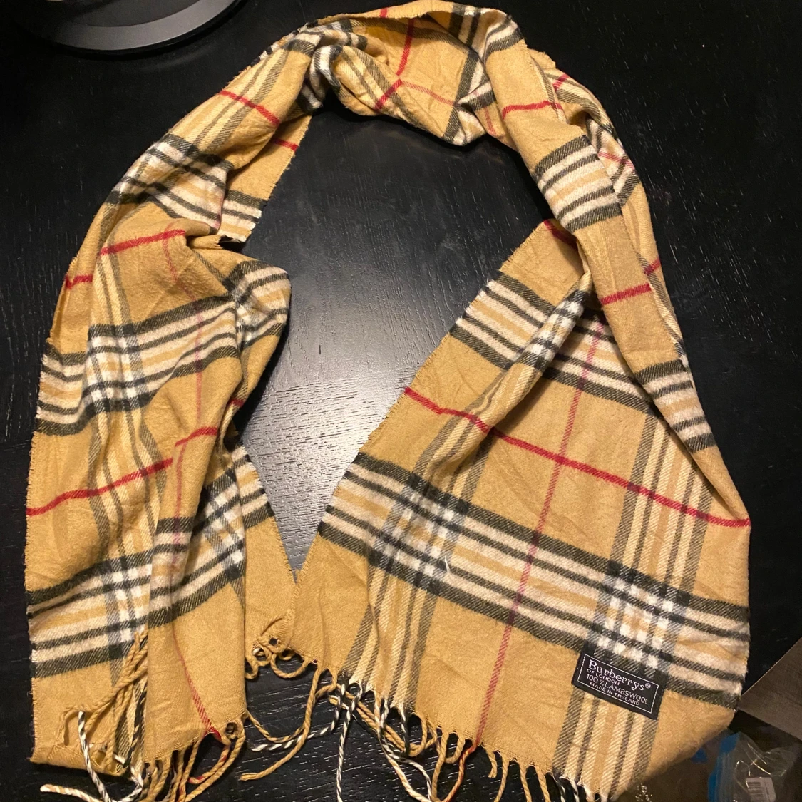 HELT NY Klassisk rutig halsduk från Burberry i 100% lammull. Beige bas med svarta, vita och röda ränder, samt fransar i ändarna. Perfekt accessoar för att lyfta din outfit