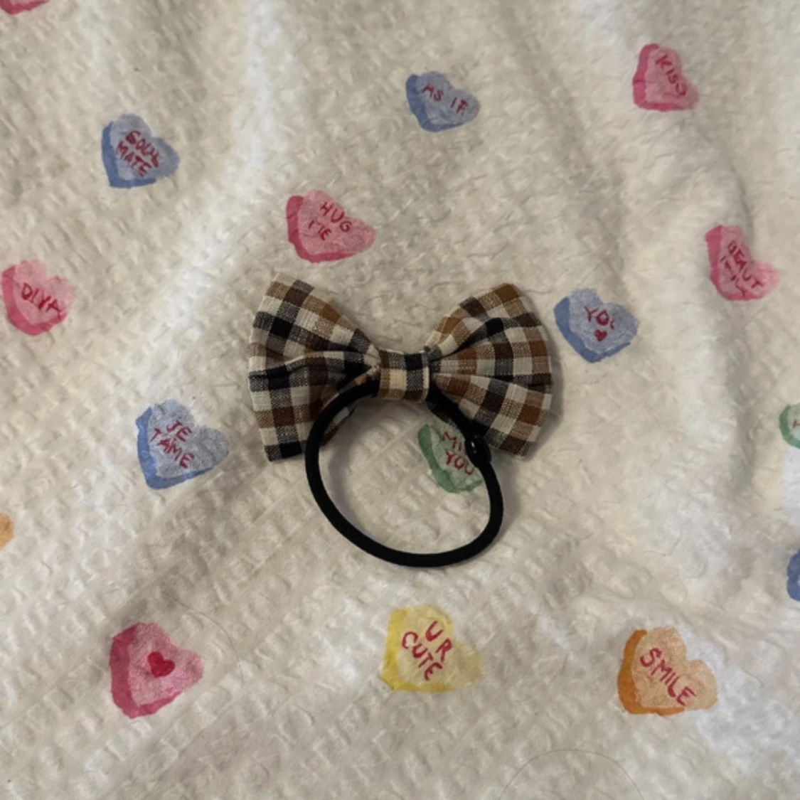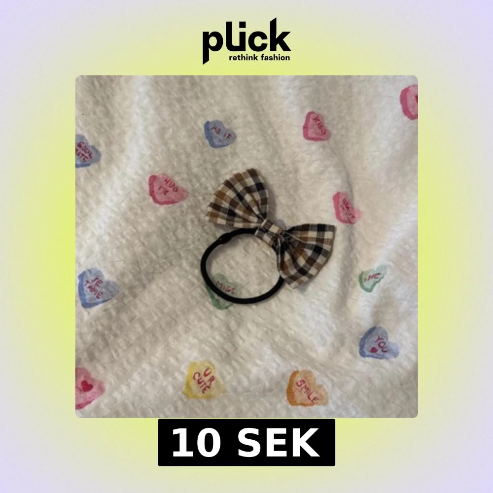 Söt hårsnodd med en brun, svart och vit rutigt rosett. Säljer pga kommer inte till användning