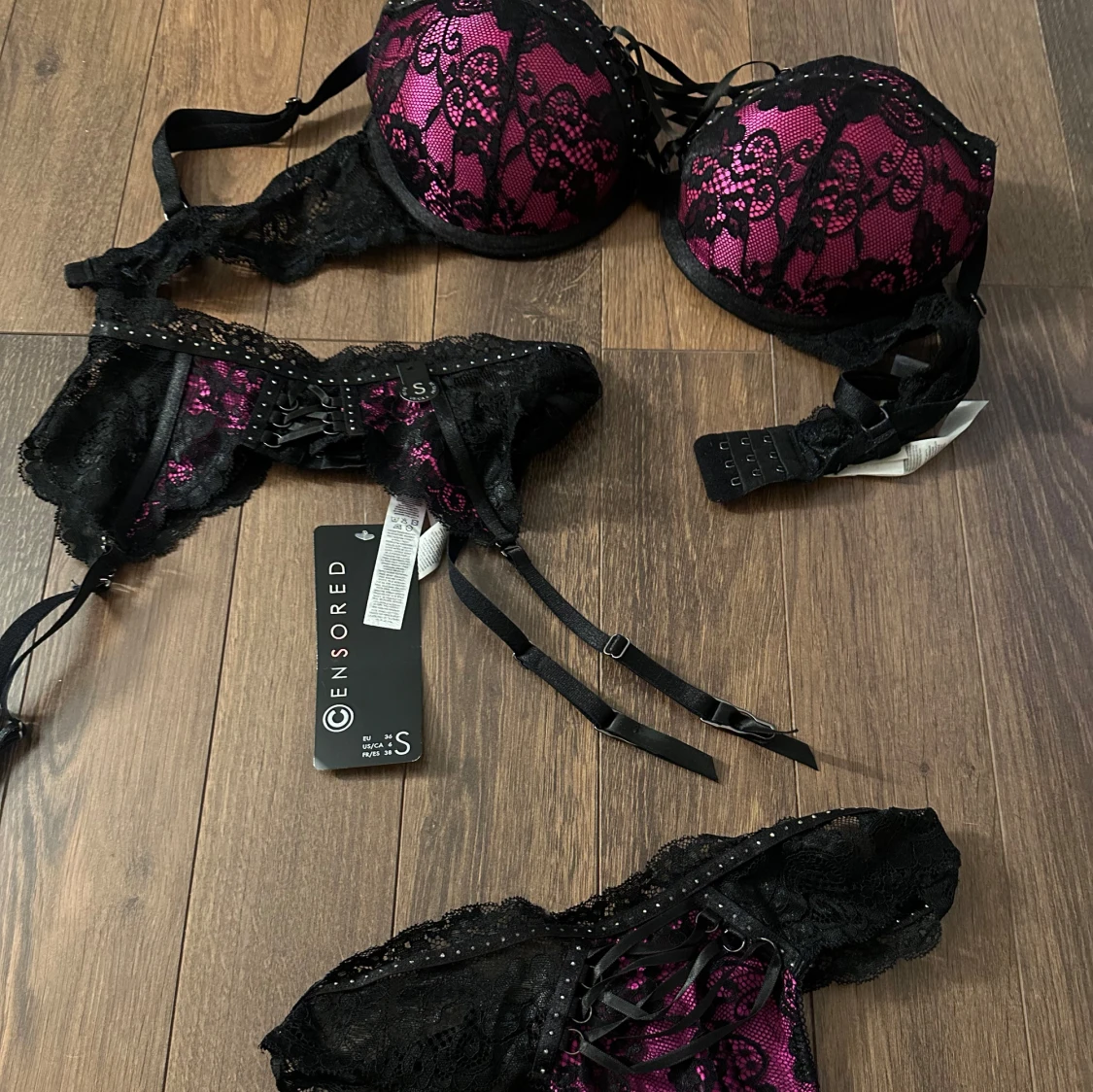 Elegant underklädesset i svart och rosa från Censored. Setet består av en bh med vadderade kupor och spetsdetaljer samt matchande trosor med snörning. Perfekt för en speciell kväll. Aldrig använd