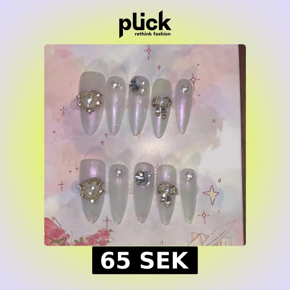 Säljer ett set långa, spetsiga lösnaglar i skimrande ljusrosa med 3D-dekorationer. Naglarna har pärlor, stora strasstenar, hjärtan med gulddetaljer och söta rosetter. Perfekt för dig som vill ha en extra glam och söt look.