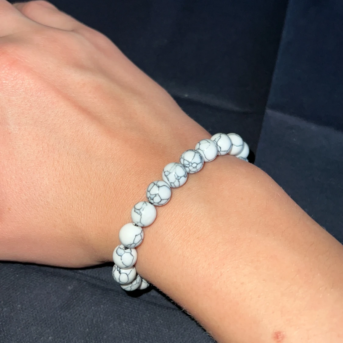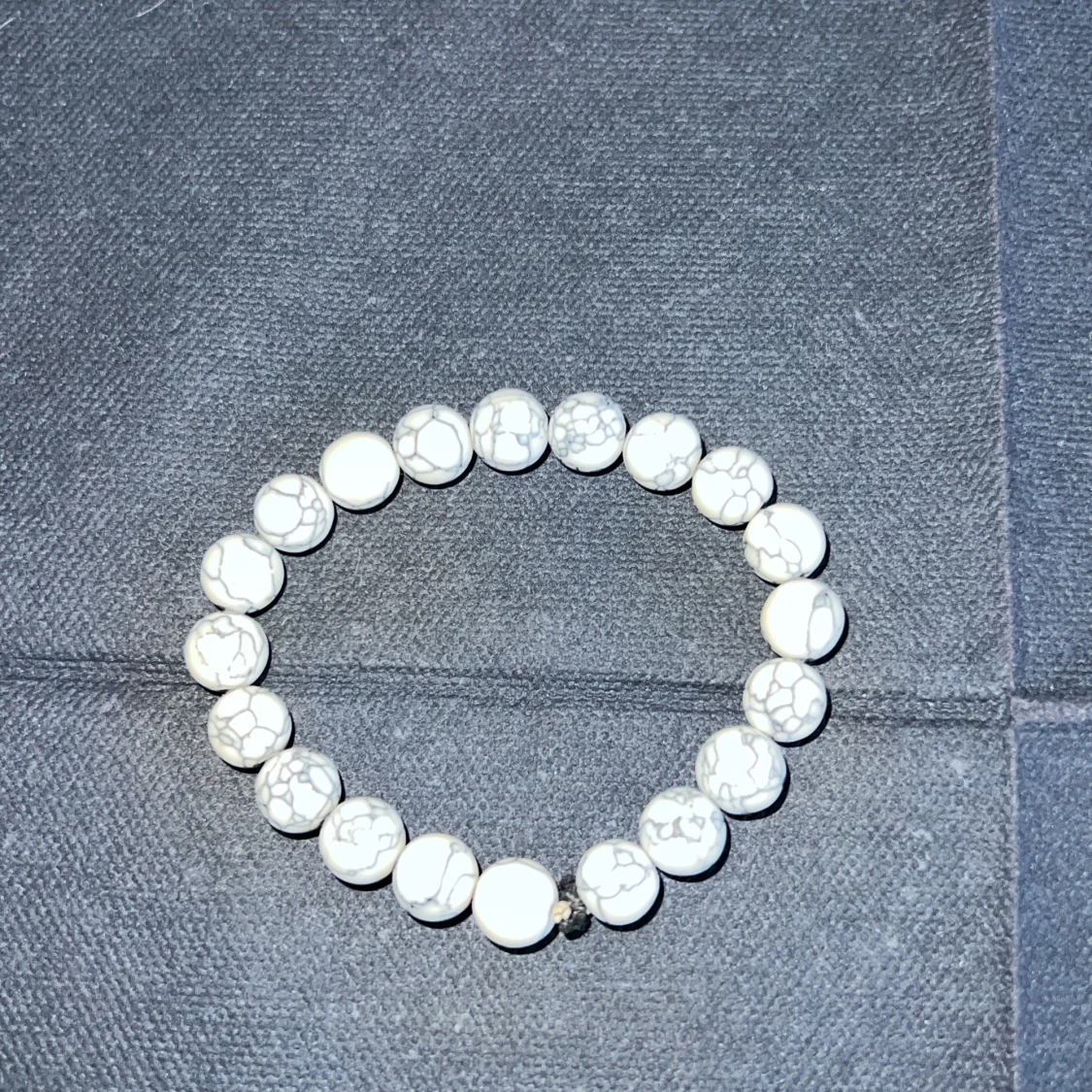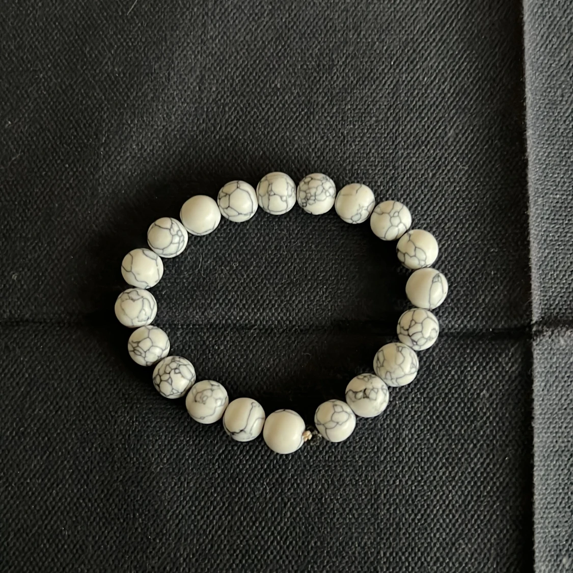 Snyggt elastiskt armband med vita marmorerade pärlor. Perfekt accessoar för att ge en stilren touch till din outfit. Passar bra till både vardag och speciella tillfällen. Skicka gärna pris förslag