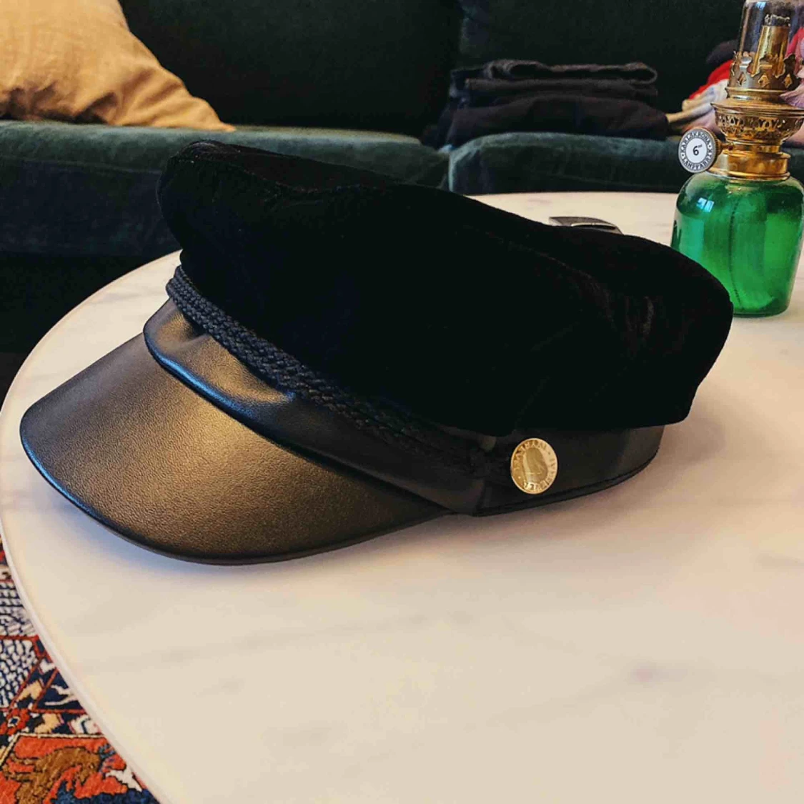 Skepparmössa från Ivyrevel i sammet. Flätade band framtill. Storlek M/L Använd 2-3 ggr. Nyskick. 120 + frakt