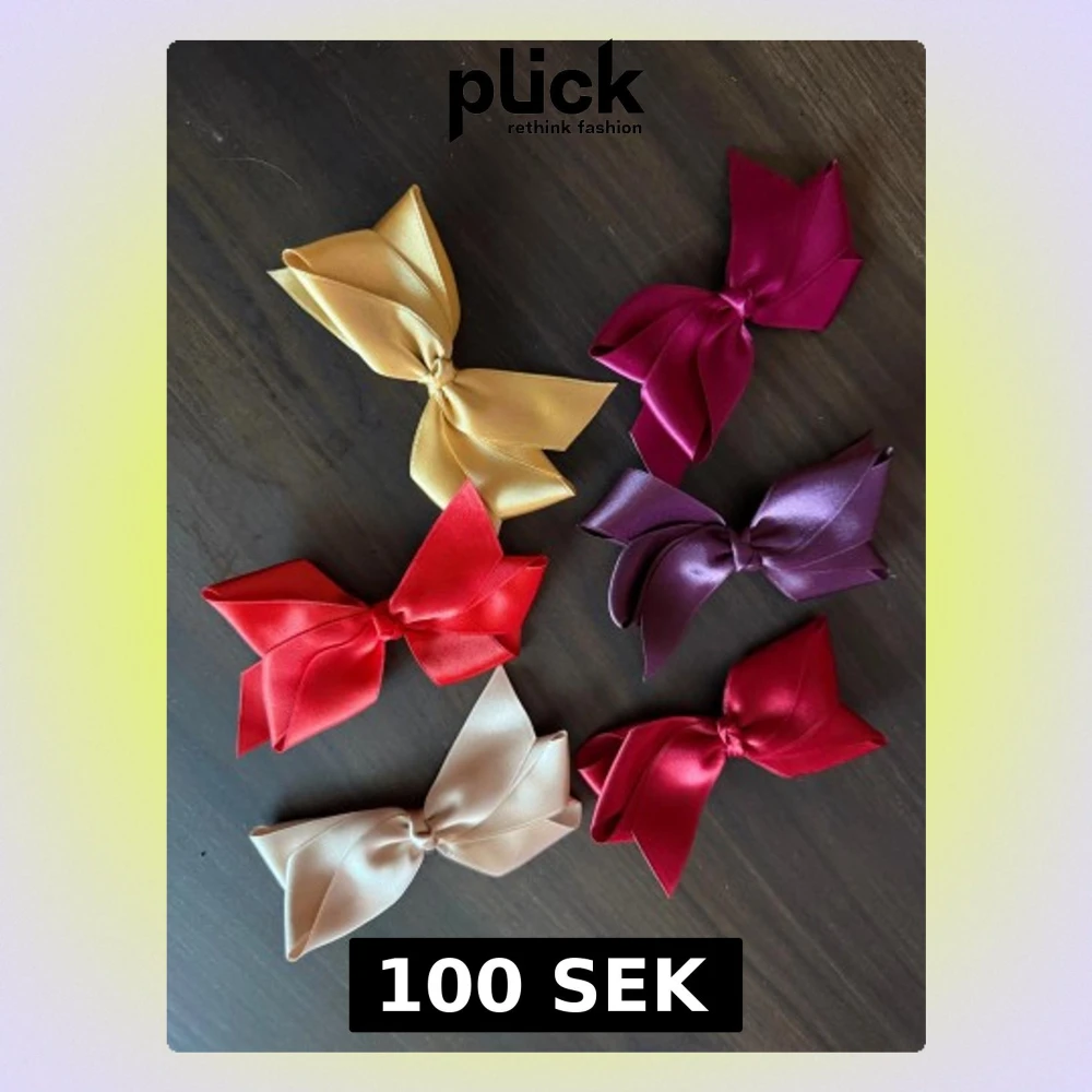 Säljer sex rosetter i satin med metallklämma på baksidan. Färgerna är guld, vinröd, lila, röd och beige. Perfekt för alla jul och nyårs outfits.