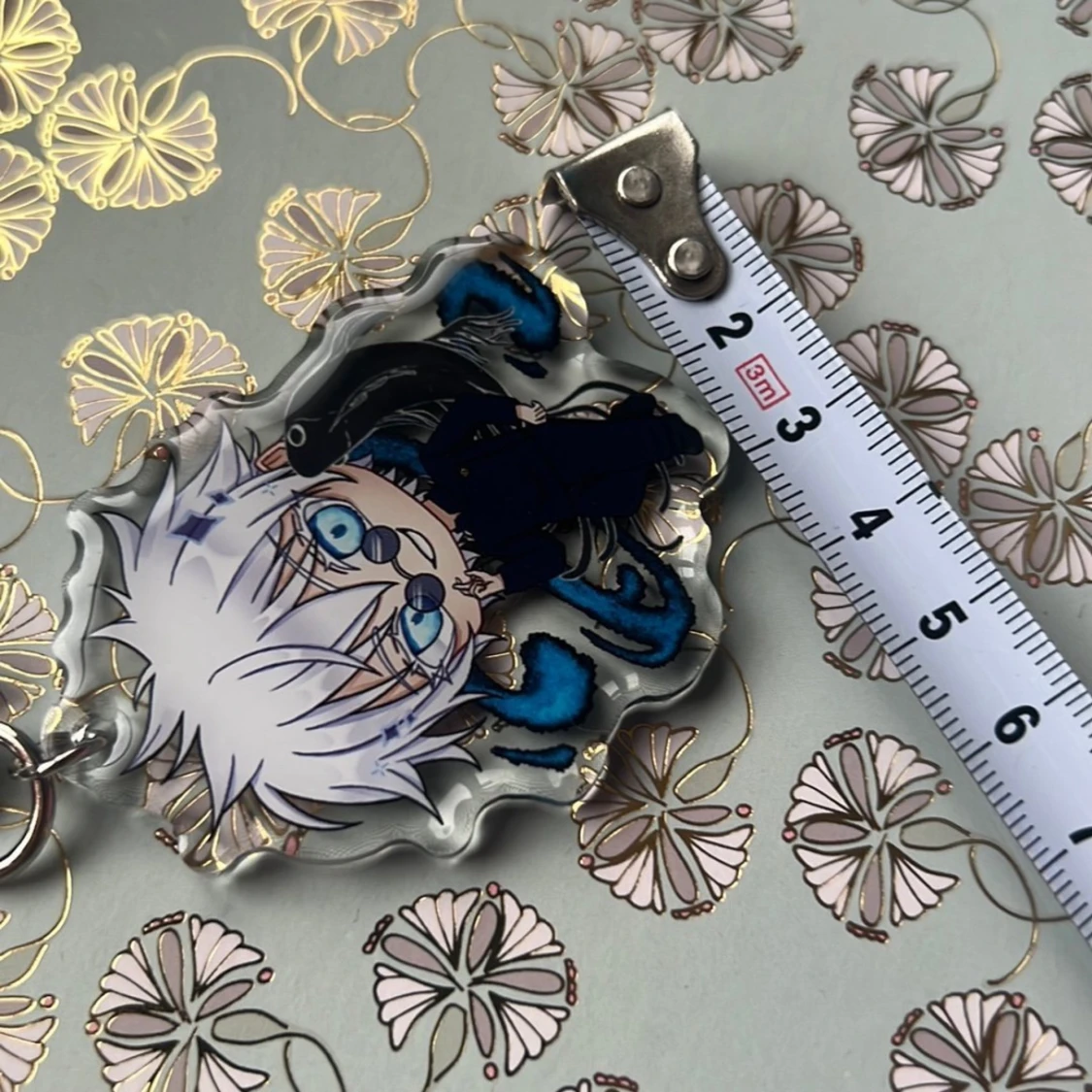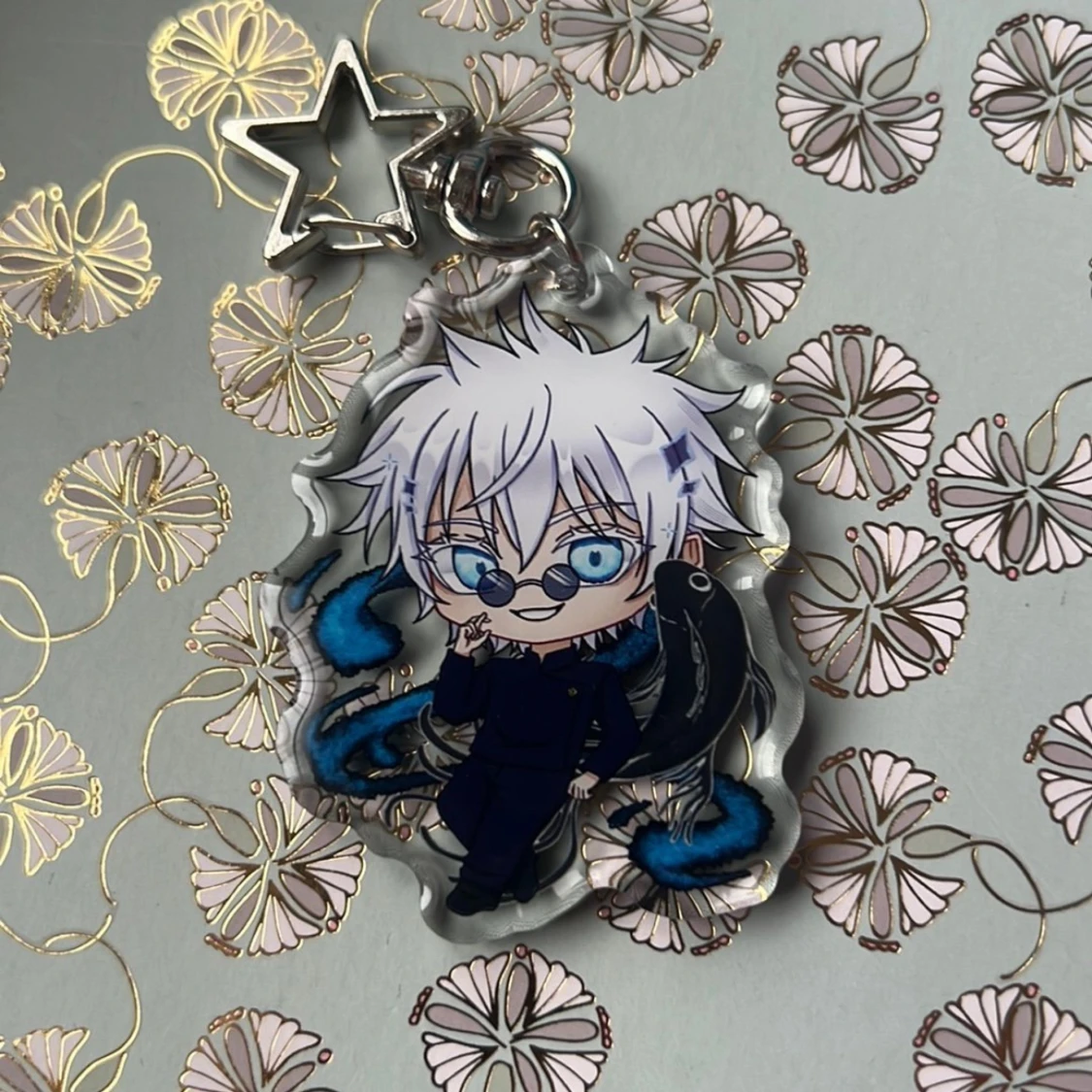 Keychain of Gojo from Jujutsu Kaisen! Perfect for your bag decorations or collection :) With resin on both sides making it look extra glossy!