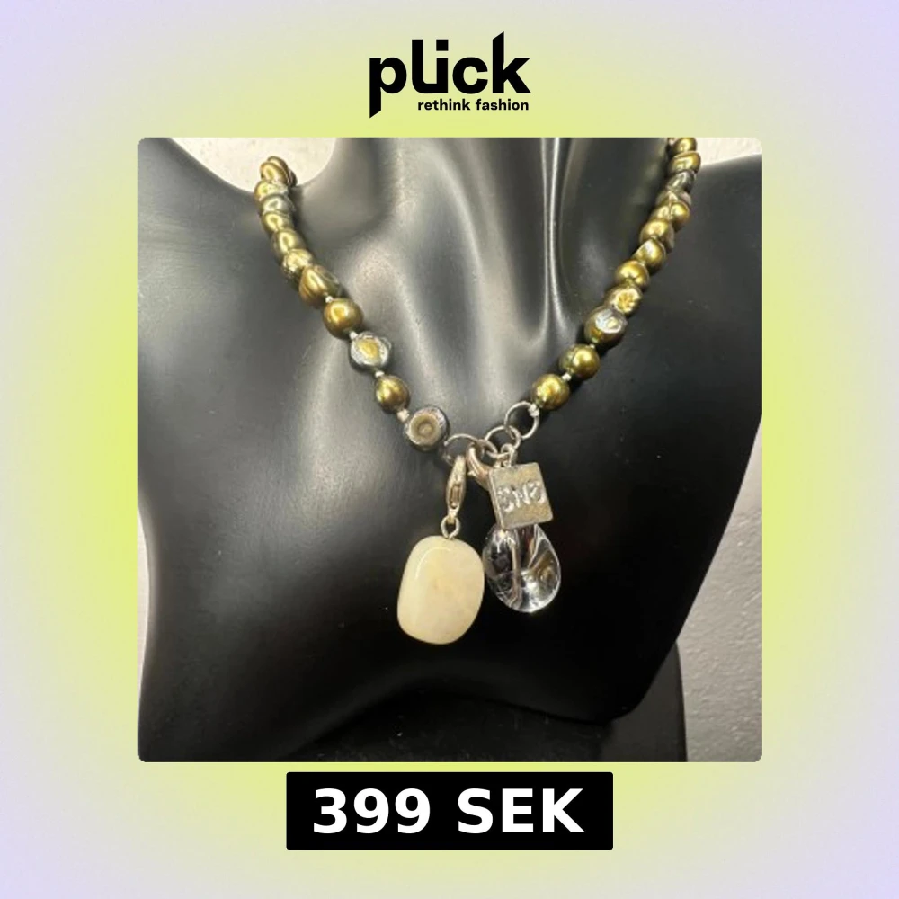 Sällsynt halsband från en av SNÖ of Swedens tidiga kollektioner. Smycket består av skimrande gröna sötvattenspärlor och två avtagbara hängen i halvädelstenar – en klar bergkristall och en ljus sten med varm ton (aventurin/kalcit). Halsbandet är ca 40 cm långt och kan stylas på flera sätt tack vare de avtagbara hängena. Originalask medföljer, vilket gör det extra attraktivt för samlare och den som uppskattar tidig SNÖ-design. Jag prutar inte men erbjuder rabatt vid köp av flera saker.