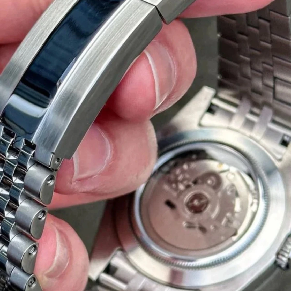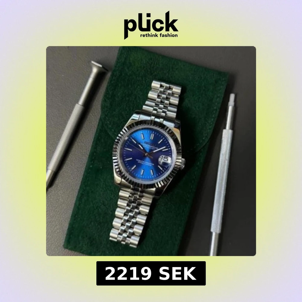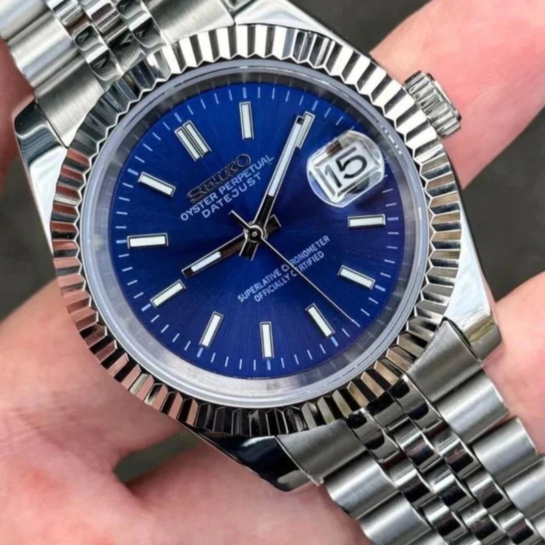 Säljer en snygg Seikmod Oyster Perpetual Datejust med blå urtavla och datumvisning. Klockan har ett klassiskt jubilee-armband i silverfärgat stål och räfflad bezel. Automatisk urverk syns genom baksidan. Perfekt för dig som gillar stilrena accessoarer.