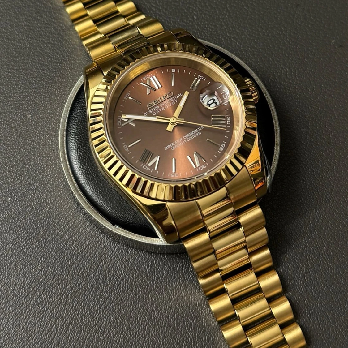 Snygg Seiko Oyster Perpetual Datejust med automatisk urverk, guldigt armband och boett. Urtavlan har en cool brun ton med romerska siffror och datumfönster vid kl 3. Länken är robust och glänsande, perfekt för dig som gillar statement-accessoarer.