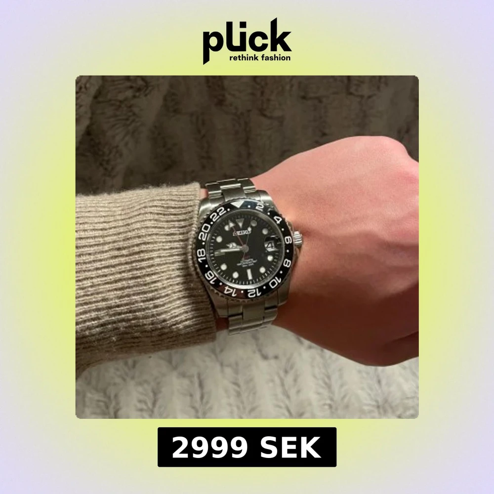 Svin snygg Seiko klocka med svart urtavla och datumvisning. 40mm. Den har en silverfärgad boett och armband i rostfritt stål. Klockan har en tydlig 24-timmarsmarkering på den svarta ringen runt urtavlan. Klockan efterliknar den kända modellen GMT. Alla länkar tillkommer såklart vid köp.