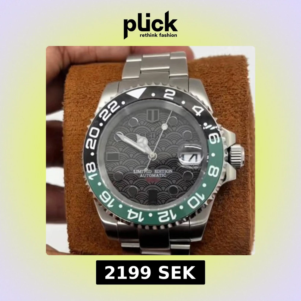 Snygg Seiko Limited Edition automatklocka i silverfärgat stål. Urtavlan har ett vågigt mönster i svart och grått, och vridringen är svart och grön med vita siffror. Klockan har datumfönster och robust länkarmband i metall.