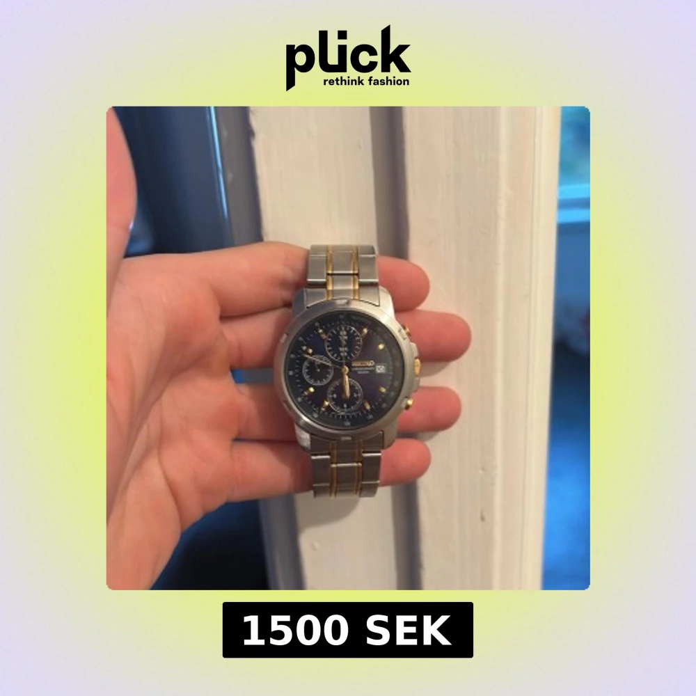 Säljer en snygg Seiko kronograf med rund boett och länkarmband i silverfärgat stål med guldfärgade detaljer. Urtavlan är mörkblå med tre subdials och datumvisning. Klockan har tydliga knappar i guld på sidan och klassisk Seiko-gravyr på baksidan.