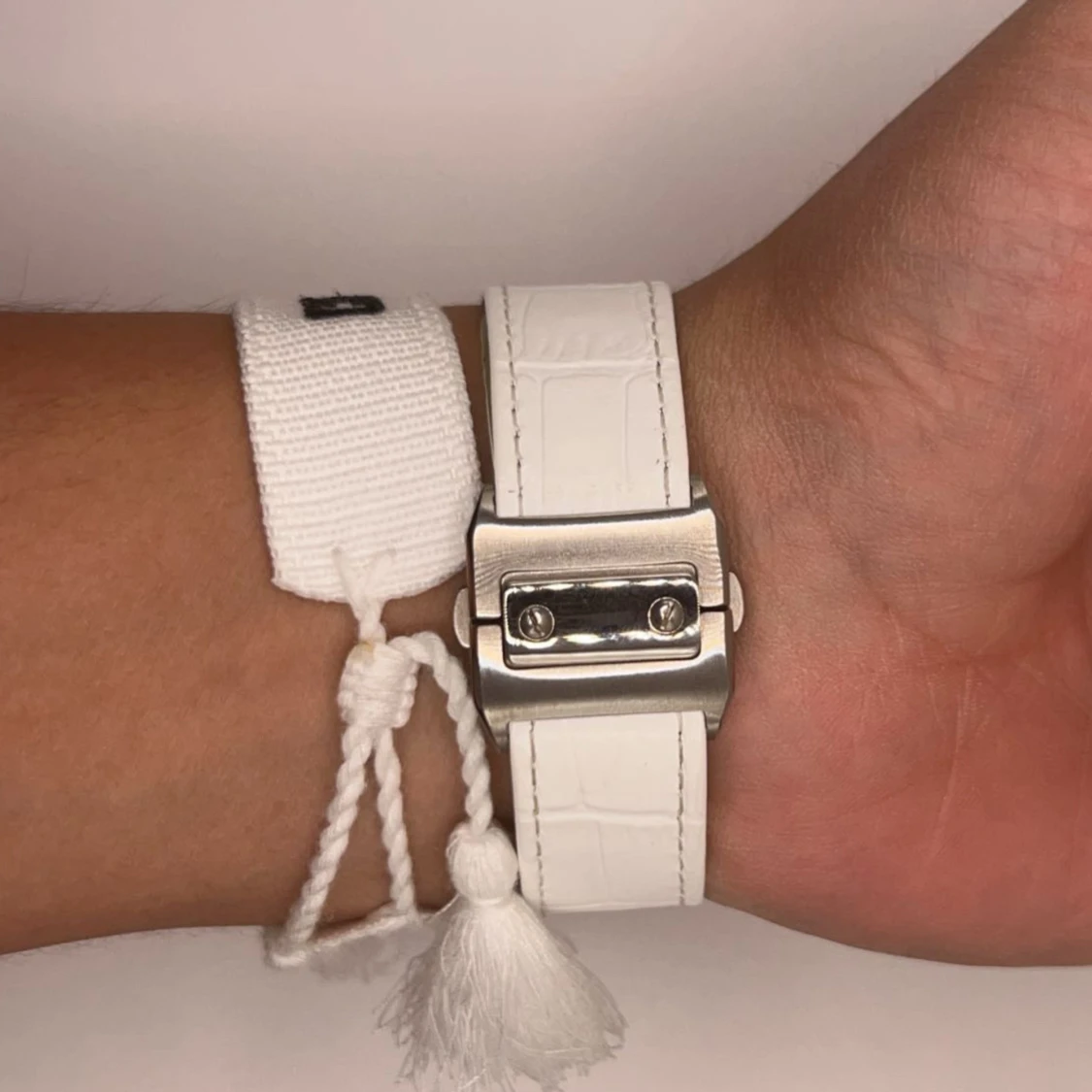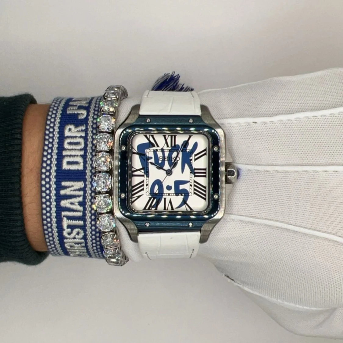 Unik Seiko klocka med fyrkantigt boett i silver och blått, vit urtavla med romerska siffror och blå graffiti-text. Vit läderrem med krokodilstruktur och robust spänne i metall. Automatisk mekanism synlig på baksidan. Perfekt för dig som vill sticka ut.