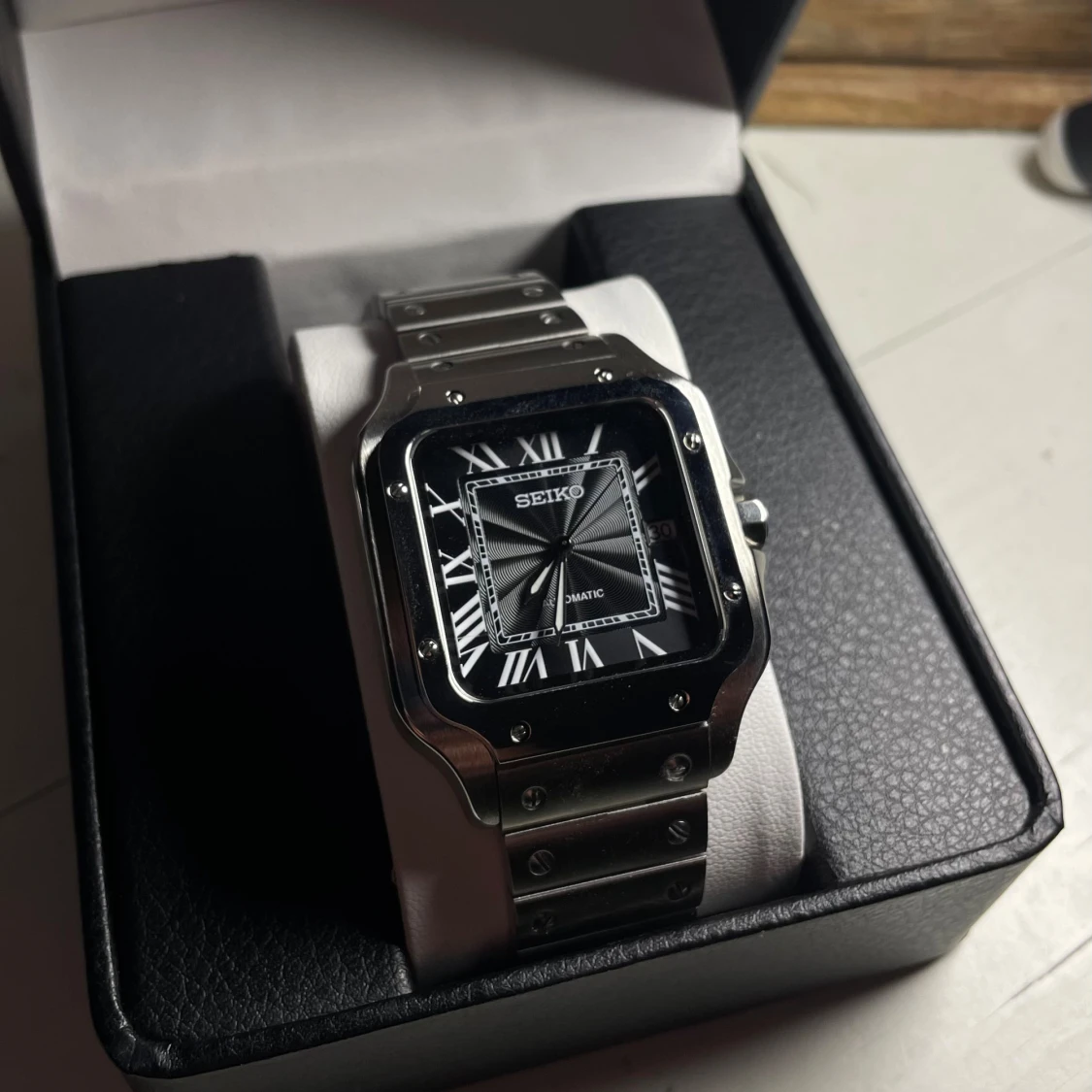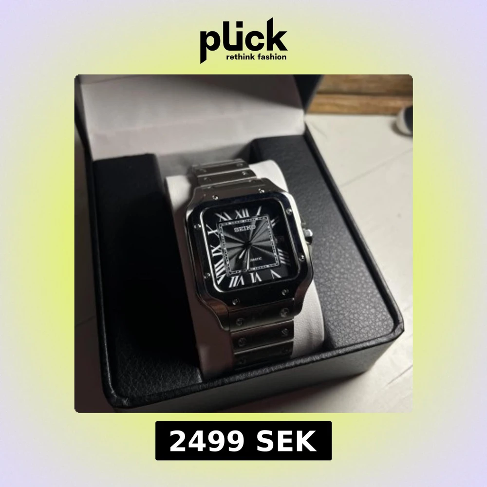 Helt nybyggd Seiko Santos Mod Specifikationer: Storlek: 38mm Urverk: Nh35 (Automatiskt) Material: 904L Rostfritt Stål Glas: Sapphire Glas Datumvisare Boett: Fyrkantig Tavla: Svart/grå Armband: Butterfly lås Krona: blå kristall Sten Vattentålighet: 30 Meter Klocklåda ingår