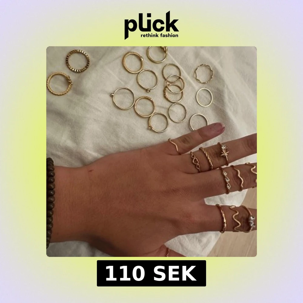 Ett stilrent set med flera tunna guld-ringar i olika designer. Perfekt för att mixa och matcha. Vissa ringar har små detaljer som stenar och mönster.