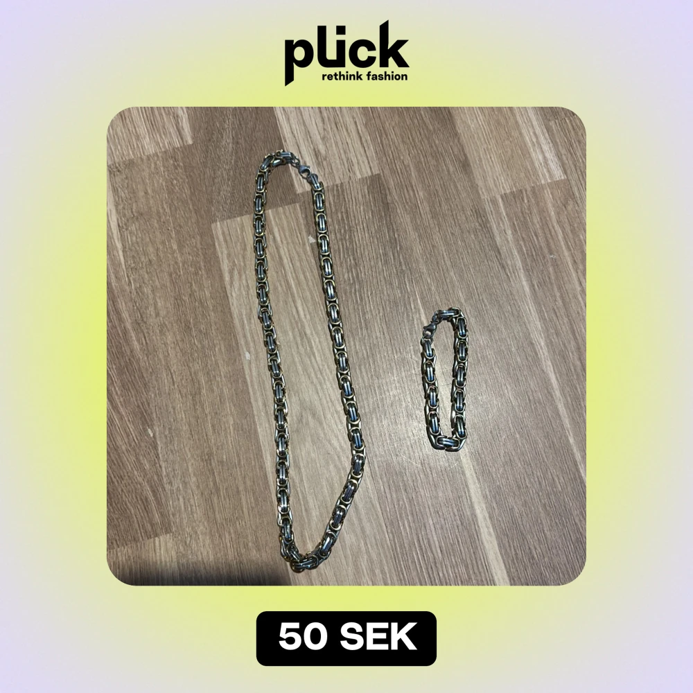 Säljer ett snyggt set med halsband och armband i metall. Båda har en cool kedjedesign med en mix av silver och guldtoner. Perfekt för att ge din outfit en edgy touch. Passar både till vardags och fest!