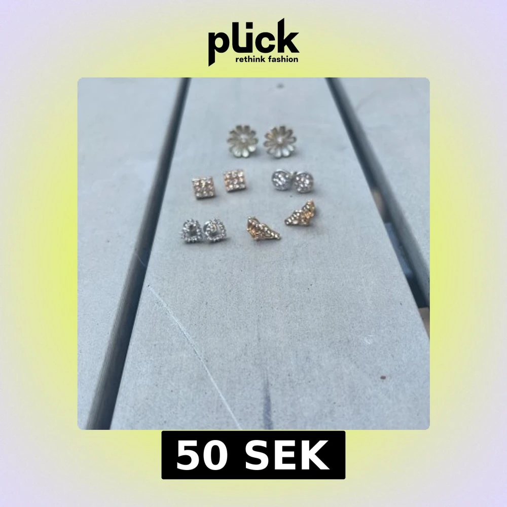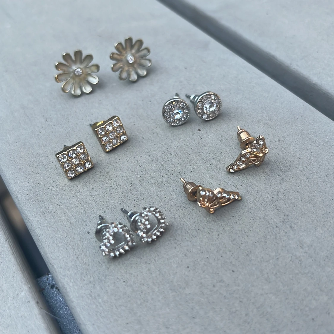 Säljer ett set med sex par örhängen i olika former: blommor, hjärtan, fjärilar, runda och fyrkantiga studs. Färgerna är guld och silver, alla med glittrande stenar. Perfekt för att mixa och matcha till olika looks.