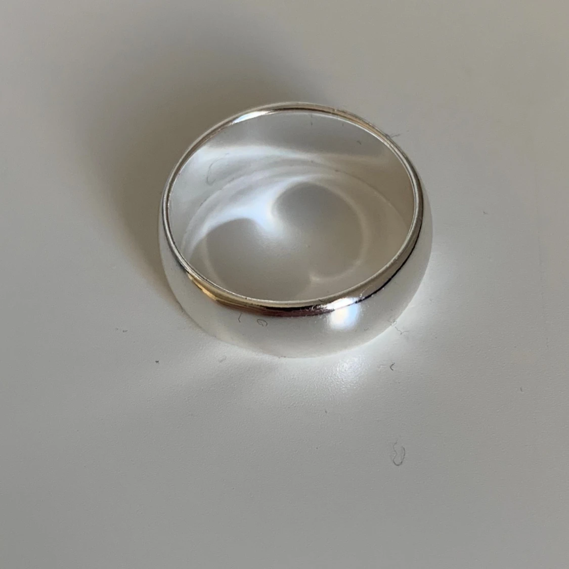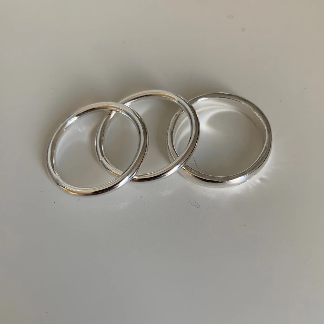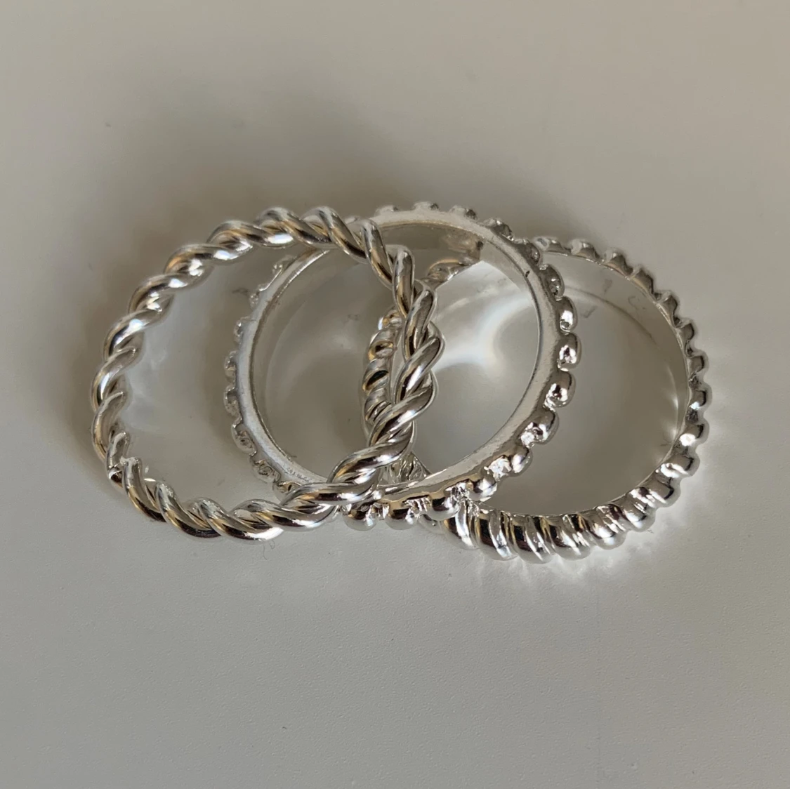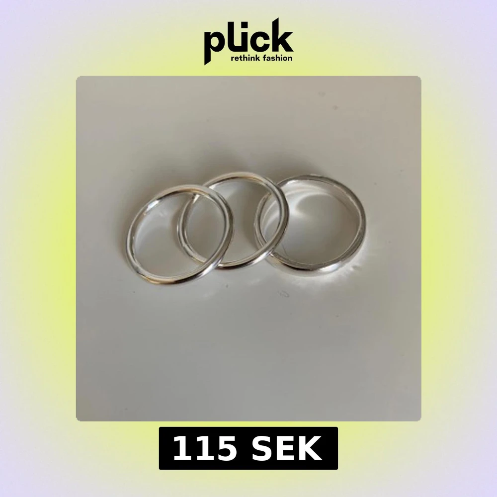 Säljer ett set med sju stilrena ringar i silverfärg. Tre är enkla och släta, tre har tvinnad och bubblig design och en är bredare och klassiskt rund. Perfekta att mixa och matcha för en trendig look. De är i helt nytt skick och jag har aldrig andvändt de