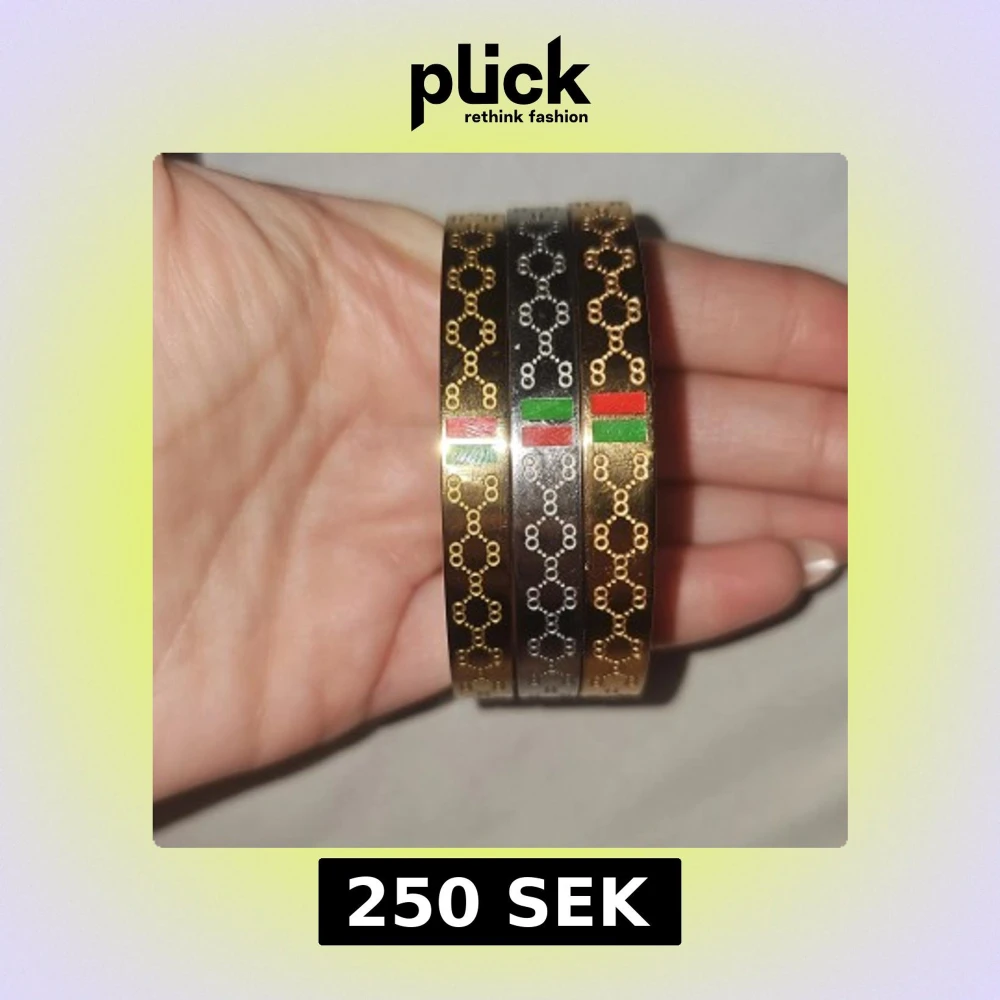 Snygga armband i ett set om tre, med en i guld en i brons och ett i silver. De har ett elegant mönster med små kedjelänkar och detaljer i rött och grönt. Perfekt för att ge en stilfull touch till din outfit.