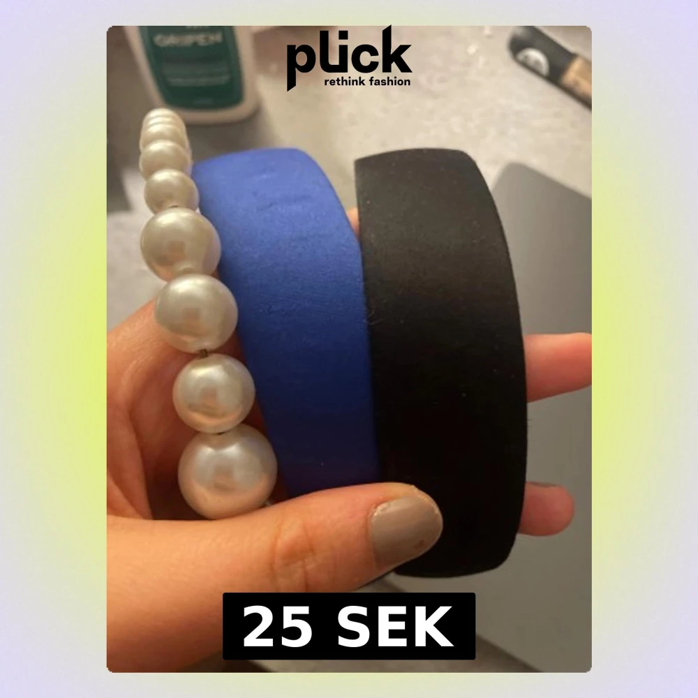 Säljer ett set med tre hårdiadem. Ett diadem är täckt med stora vita pärlor i plast, ett är klätt i blått tyg och det tredje är helsvart med sammetsliknande yta. Perfekt för att ge din frisyr en extra touch och variera din look❤️25kr för alla