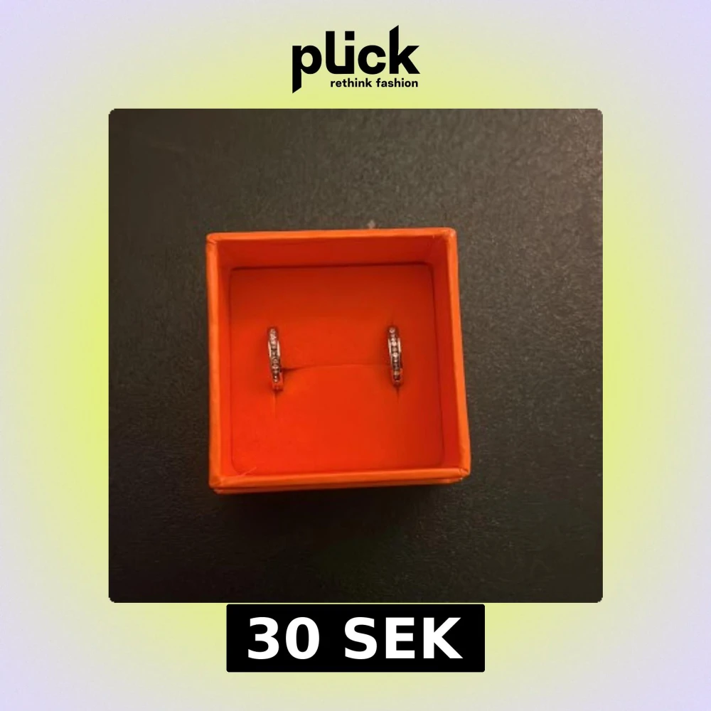 Säljer ett par stilrena silverfärgade örhängen med små rosa stenar.